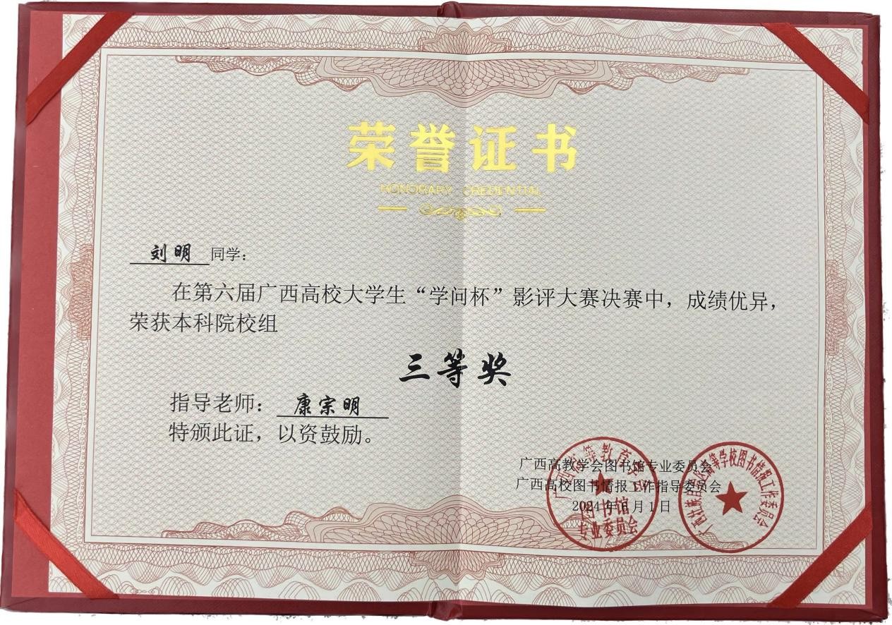 喜报|我校学生在广西高校图书馆"学问杯"影评大赛中斩获三等奖