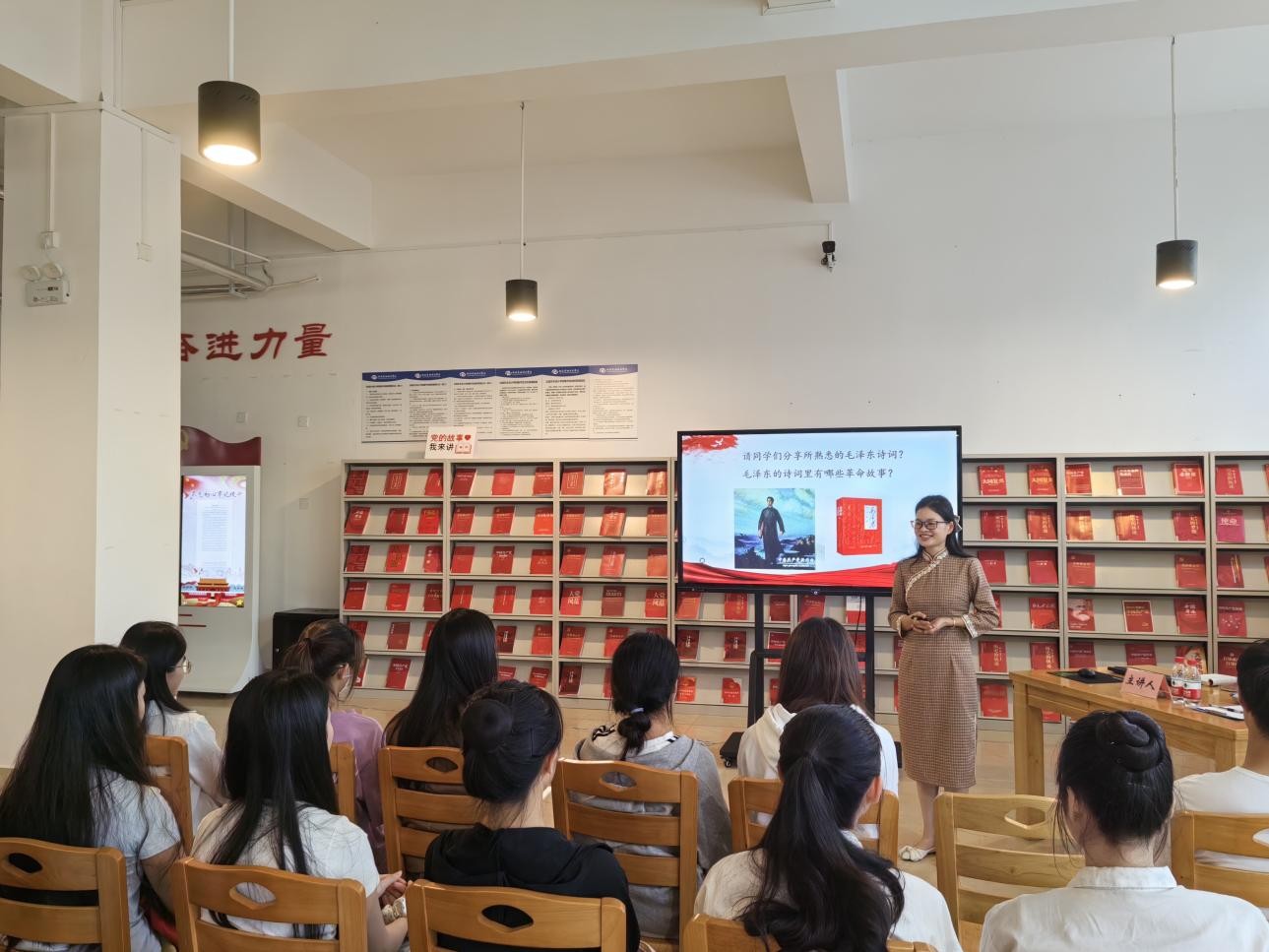 11月7日下午5:00,刘贻敏老师在图书馆三楼“红色阅读角”举办红色知识专题讲座,本期讲座的主题是红色记忆 历史丰碑——毛泽东诗词里的党史。我校舞蹈学院积极分子到场聆听讲座并参与互动,氛围良好,同学们纷纷表示受益匪浅。(张家梅摄)