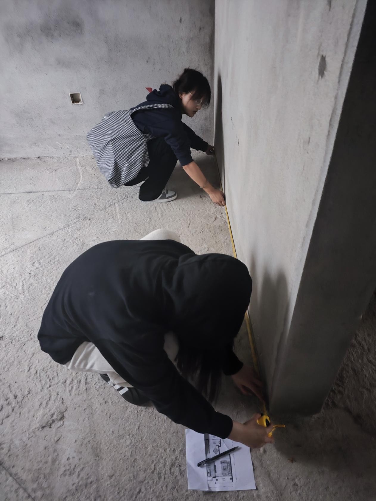 学生们听讲解的时候十分认真,有些同学还记录了笔记,在讲解之后小组组员合作一起将指定的套房按规定量好,并观察记录了门、窗、电箱、卫生间管道、厨房烟道、地漏等设施,量房过程中学生整体的积极性很高,也展示出了对于专业实践的兴趣,对于学生空洞的在教室中一直听理论课程而言,实践活动更能带动学生学习积极性,同学们通过合作办公的模式也增进了相互之间的交流,能迸发很多新的想法,也能发现很多新的问题,与老师进行交流的时候也开始理性询问一些更深层次的问题了。