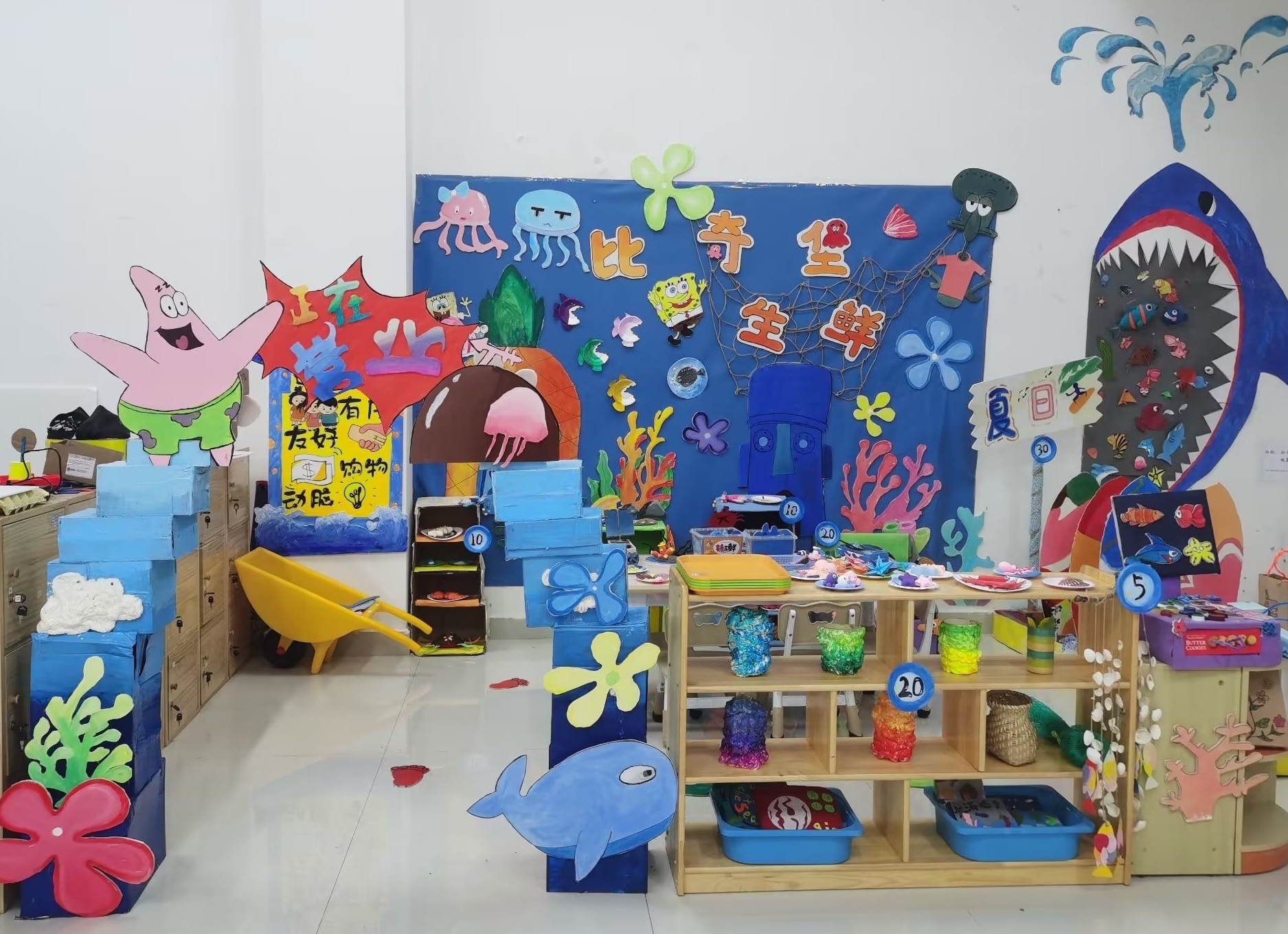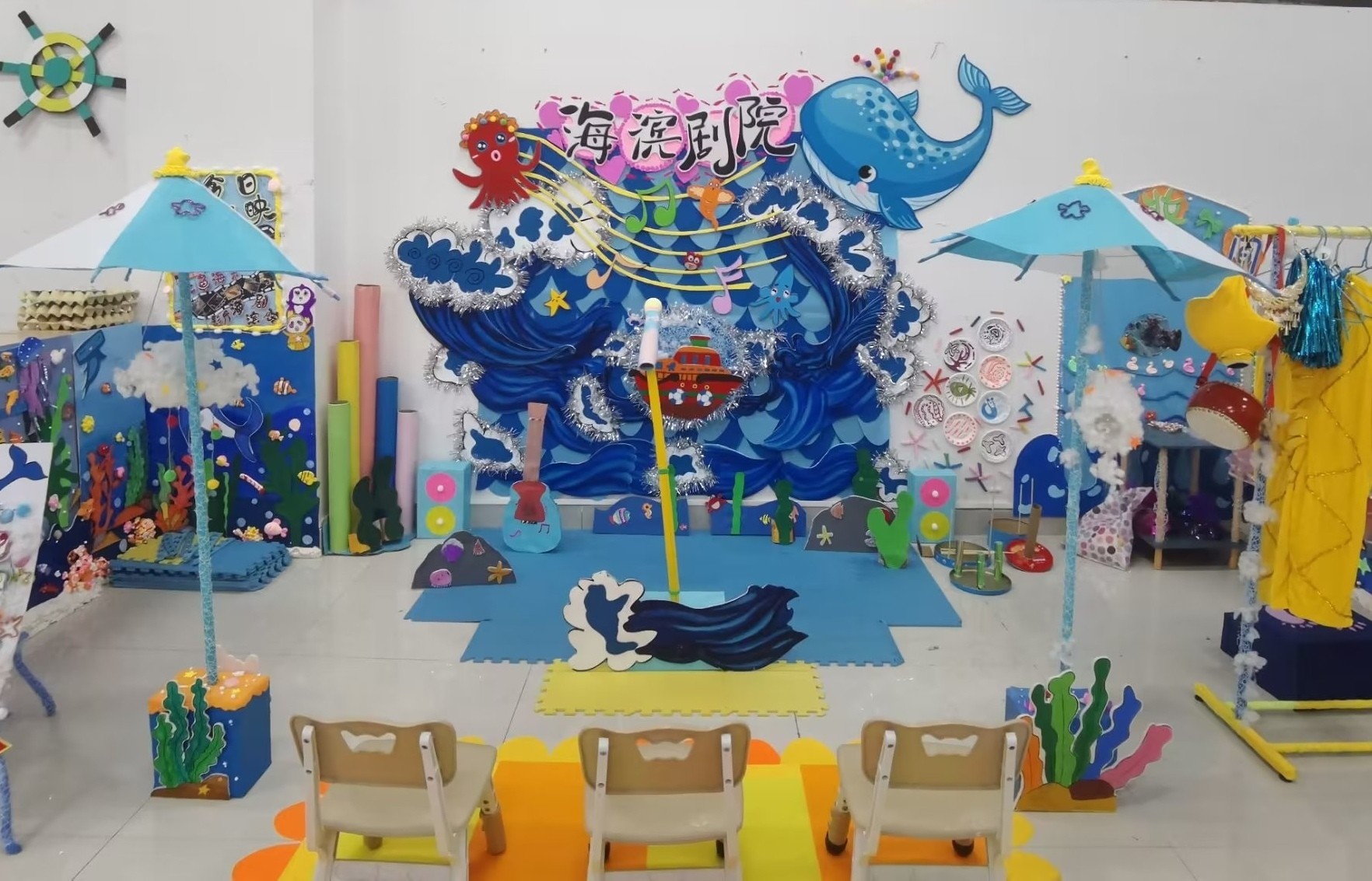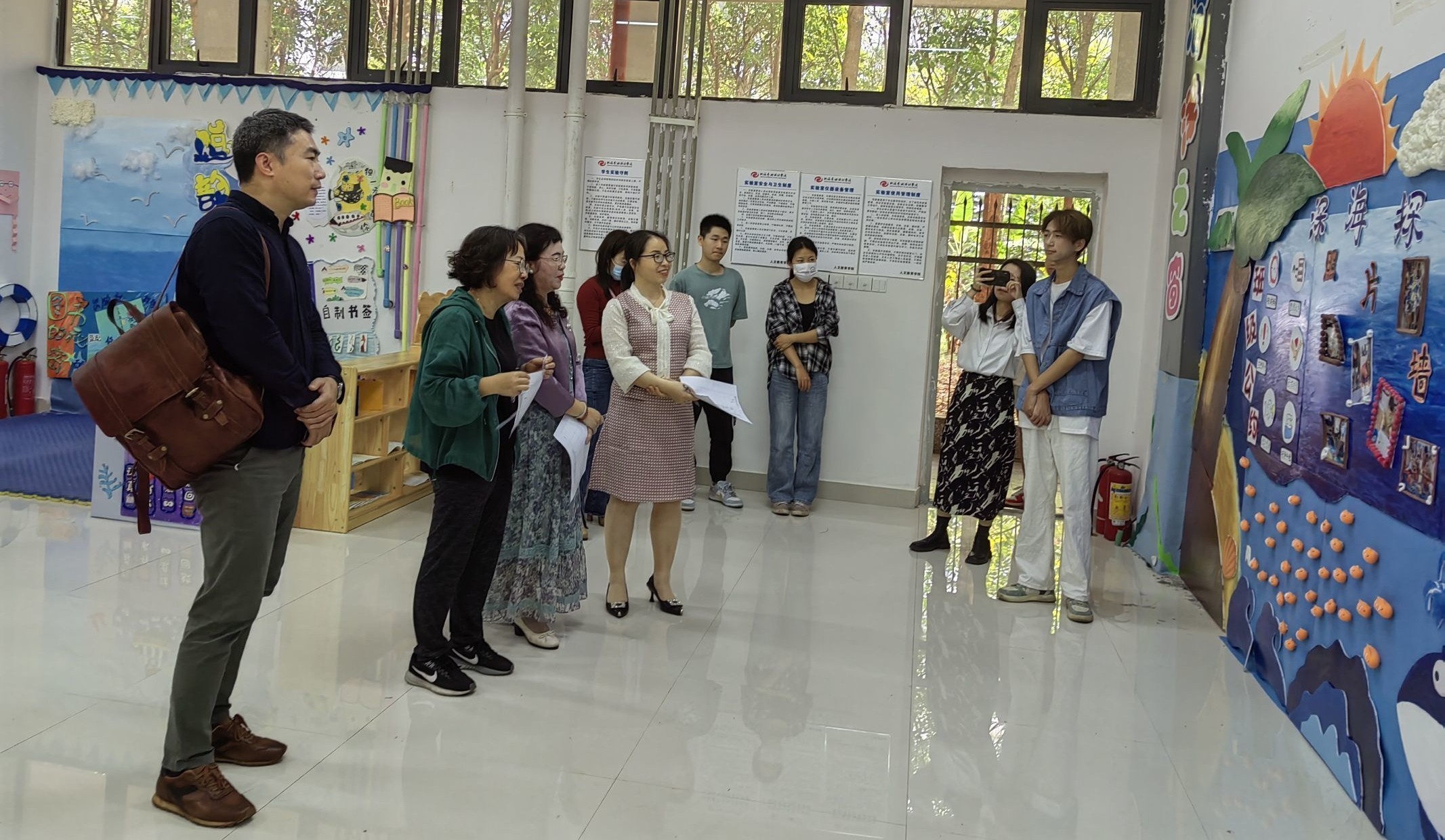 人文教育学院坚持学生发展为中心,以OBE理念为指导,产学研用一体化教学改革,加强校企共建课程,培养学生综合实践能力和创新能力。2023年3月18日,人文教育学院学前教育教研室举办2020级学前教育专业幼儿园教育环境创设课程结课汇报展。本次结课汇报展的作品以海洋文化为主题开展区域环境创设。环境创设是幼儿园课程实施的重要内容,也是幼儿园工作的基本要务,以美术为手段展示的学生环创作品,从多方面体现学生的综合素质。