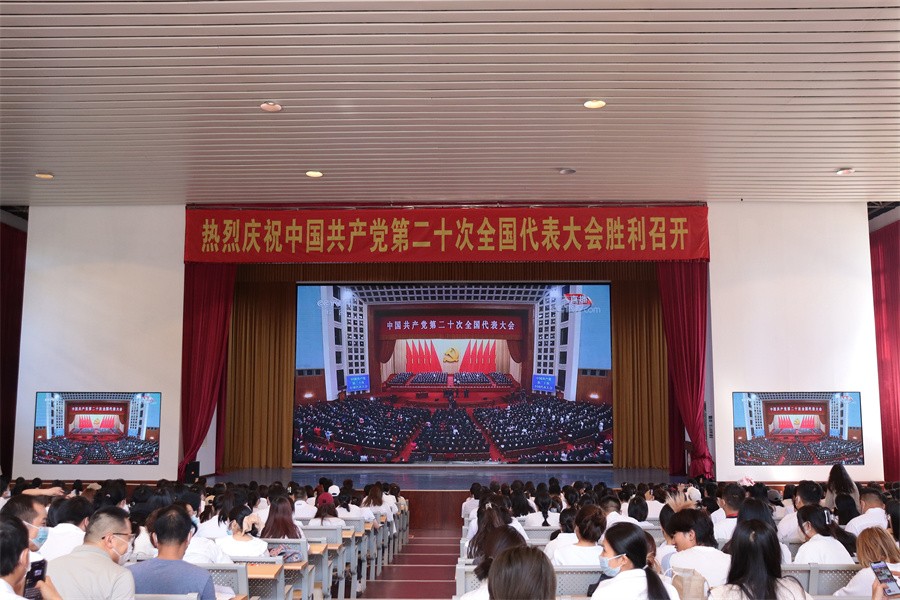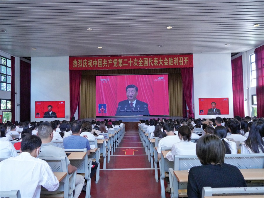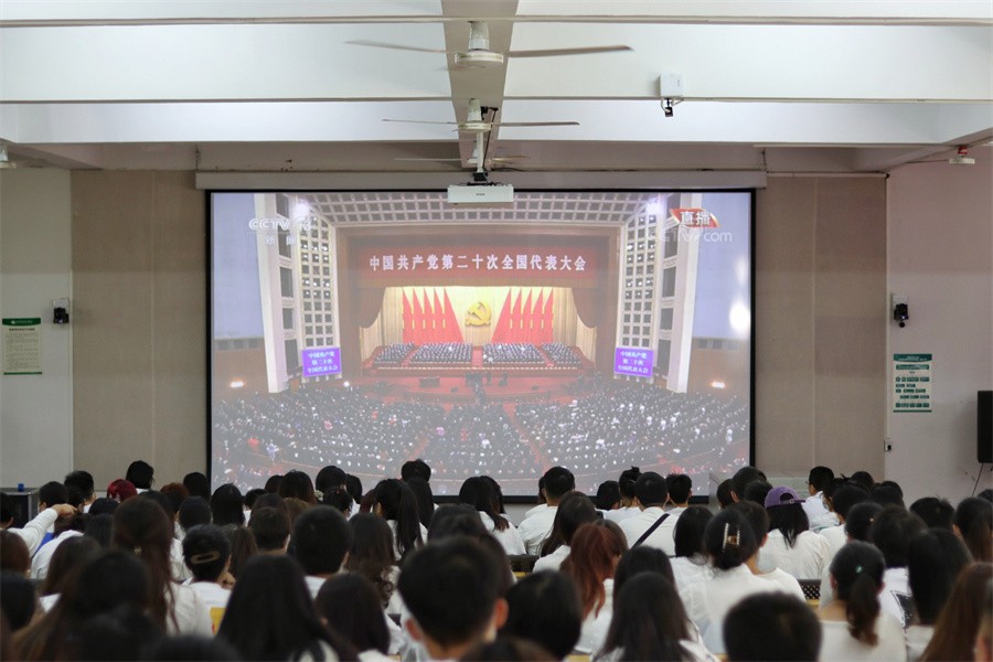 10月16日上午10点整,中国共产党第二十次全国代表大会在北京人民大会堂隆重开幕,中共中央总书记、国家主席、中央军委主席习近平代表第十九届中央委员会向大会作报告。学校党政领导班子、全体中层领导干部、党员代表、入党积极分子和学生干部1000余人在学校大礼堂和伦理楼107教室集体收看大会实况。其他师生在分会场通过电视、网络、广播、手机客户端等多种形式收听收看大会开幕式现场直播盛况,第一时间学习领会大会精神。