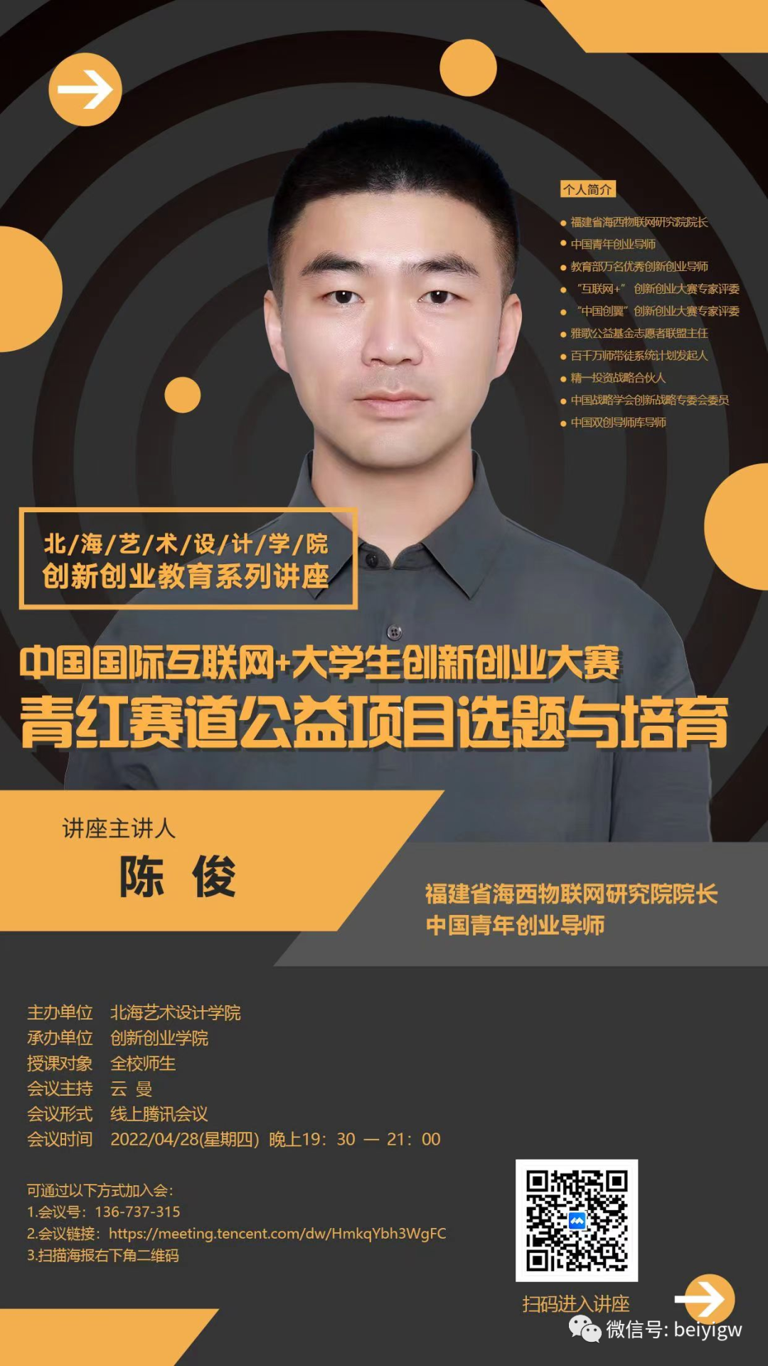 4月29日我校持续开展创新创业教育系列讲座,福州大学副教授、中国青年创业导师陈俊应邀为我校开展题为“中国国际互联网+大学生创新创业大赛——青红赛道公益项目选题与培育”的线上讲座。讲座由创新创业学院院长云曼主持。