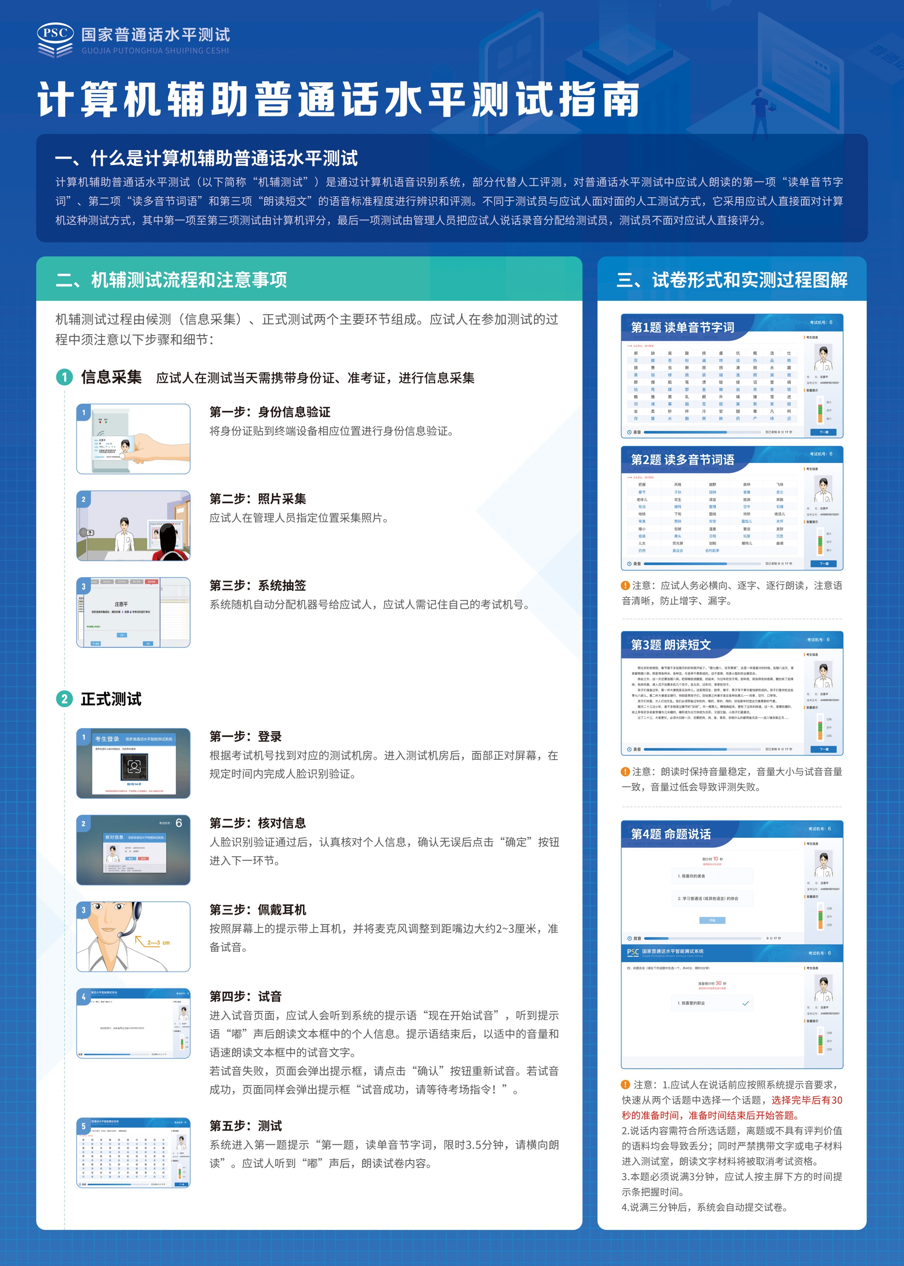 考试流程。具体考试流程按照计算机辅助普通话水平测试指南(附件1)、普通话水平测试考试指南(附件2)执行。