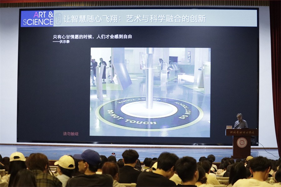 鲁晓波教授列举了达芬奇、爱因斯坦、李政道等艺术科技融合理论的重要人物事例,明确智能时代要进行人文、科技深入融合的艺术创新。他还分别从文艺复兴时期产生的艺科结合画作、自然与科学融合发展的趋势、奥运会动态标志的产生,AI3D绘画的应用等艺术与科技相辅相成共同发展的实例,指出“艺术,不会也不可能被终结”的概念,展现了艺术发展的无限可能,让在场的师生看到了艺术发展的勃勃生机。