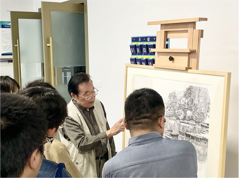 林驹教授以自身的画作为例,通过不同主题、不同风格的画作讲解针管笔绘画的技巧和要点。他指出,在绘制一幅画作时,应认真考虑构图中的虚实、黑白关系,需要先从多个角度观察自然物像、深度推敲构图,在心里有个大致图像后再进行绘画。此外,在讲解绘画局部细节时,林驹教授强调要从多个角度考虑图像的透视关系。他鼓励广大学子绘画要做到熟能生巧,勤能补拙,日常要多加练习,不断提升专业技巧能力。