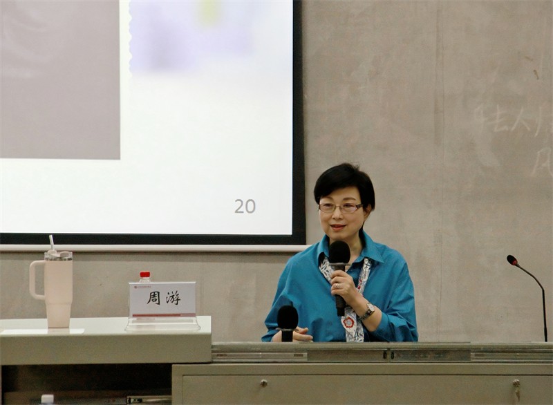 讲座伊始,周游教授以其富有感染力的声音,将现场师生带入了烽火连天的革命岁月,进而详细讲述了延安新华广播电台的历史背景、创立过程以及初代播音员的工作情况。当时的播音员在艰苦简陋的条件下,用坚定的信念和不懈的努力,将党的声音传遍了祖国的四面八方。一个个故事不仅仅是历史的见证,更是新时代青年传承红色精神、践行勤学修德的生动教材。