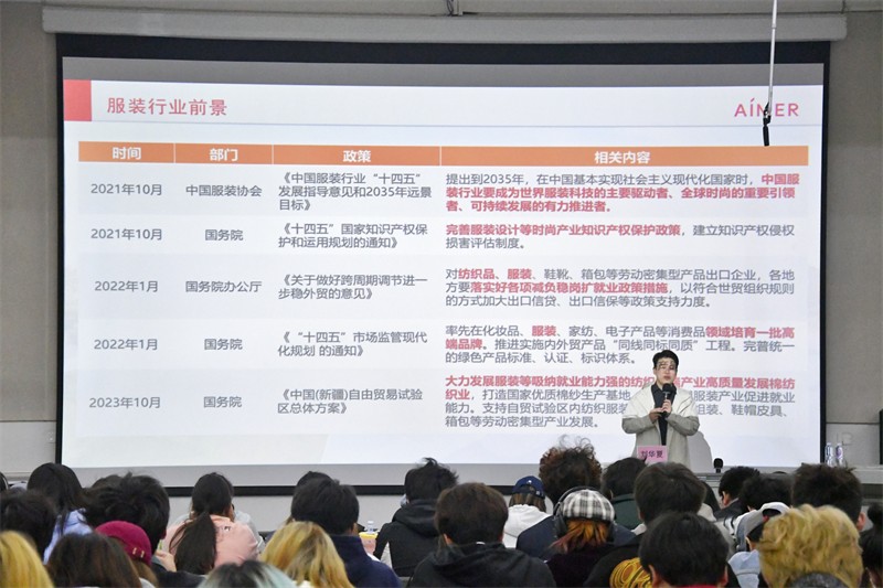讲座伊始,刘华夏经理以服装行业的现状为切入点,从国家政策和具体数据等方面进行解析,并根据师生问题一一进行解惑。我国是全球最大的纺织服装生产国、消费国和出口国,拥有庞大的服装企业数量,服装行业规模不断增长。中国服装行业即将成为世界服装科技的主要驱动者,全球时尚的重要引领者,可持续发展的有力推进者,行业发展前景大。近年来,消费者对服装个性化、品质化需求的增加,市场上对服装设计师、制版师、工艺师等专业技能人才的需求也在不断增加,除了传统服装行业,电商的快速发展也为服装设计师提供了更多新的就业机会。
