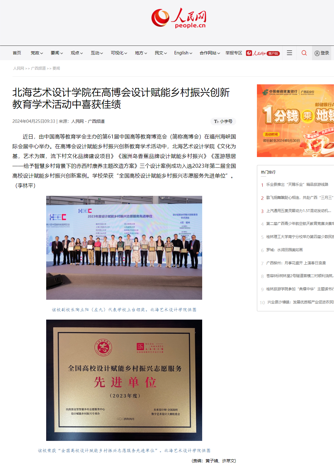 人民网:北海艺术设计学院在高博会设计赋能乡村振兴创新教育学术活动中喜获佳绩