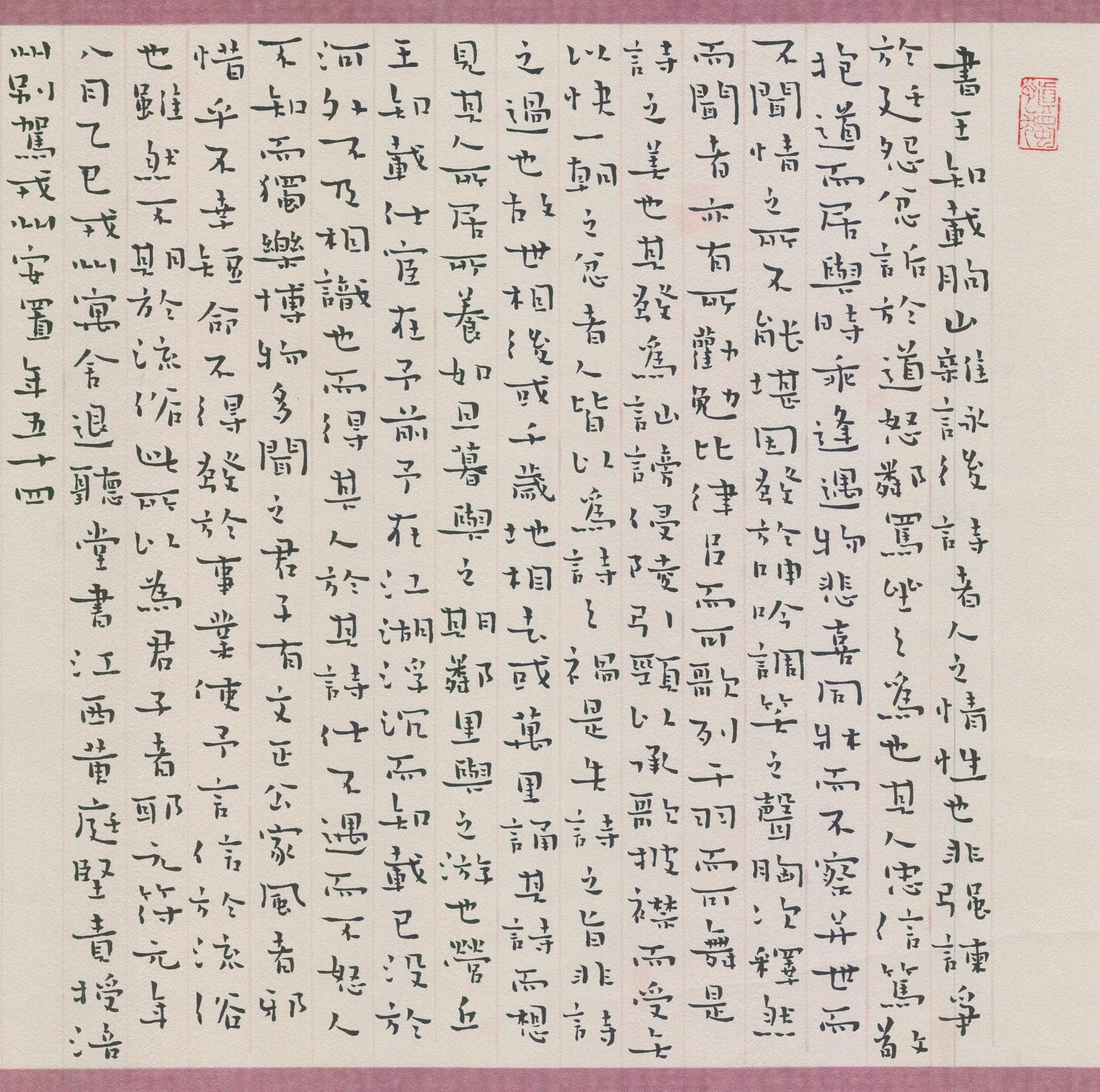 步入本科学习阶段之后,陈思思接触到了更加系统性、专业化的书法学科教育。北海艺术设计学院始终坚持着社会主义办学方向,坚持应用型办学定位,在现代化先进的教育观念的引领下,书法学院专业课程设置更是切入学习痛点,培养专业创新意识,引导学生学以致用。大一时期,陈思思在班主任的指导下几乎每日进行小楷日课,日复一日的练习中,陈思思对王宠书风的小楷逐渐有了自己的理解。王宠小楷恬淡古雅,不露锋芒,其疏淡空灵的面貌和天真烂漫的结体最得人心。陈思思也习得其中三昧,在其创作中表达了王宠字体结构脱落、文字与空间互侵等显著特点。