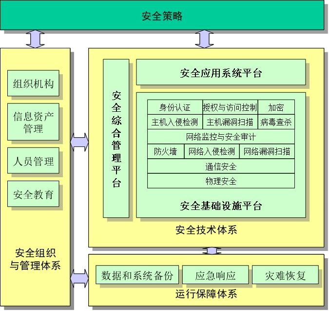 安全技术体系是整个信息安全体系框架的基础,包括了安全基础设施平台、安全应用系统平台和安全综合管理平台这三个部分,以统一的信息安全基础设施平台为支撑,以统一的安全系统应用平台为辅助,在统一的综合安全管理平台管理下的技术保障体系框架。