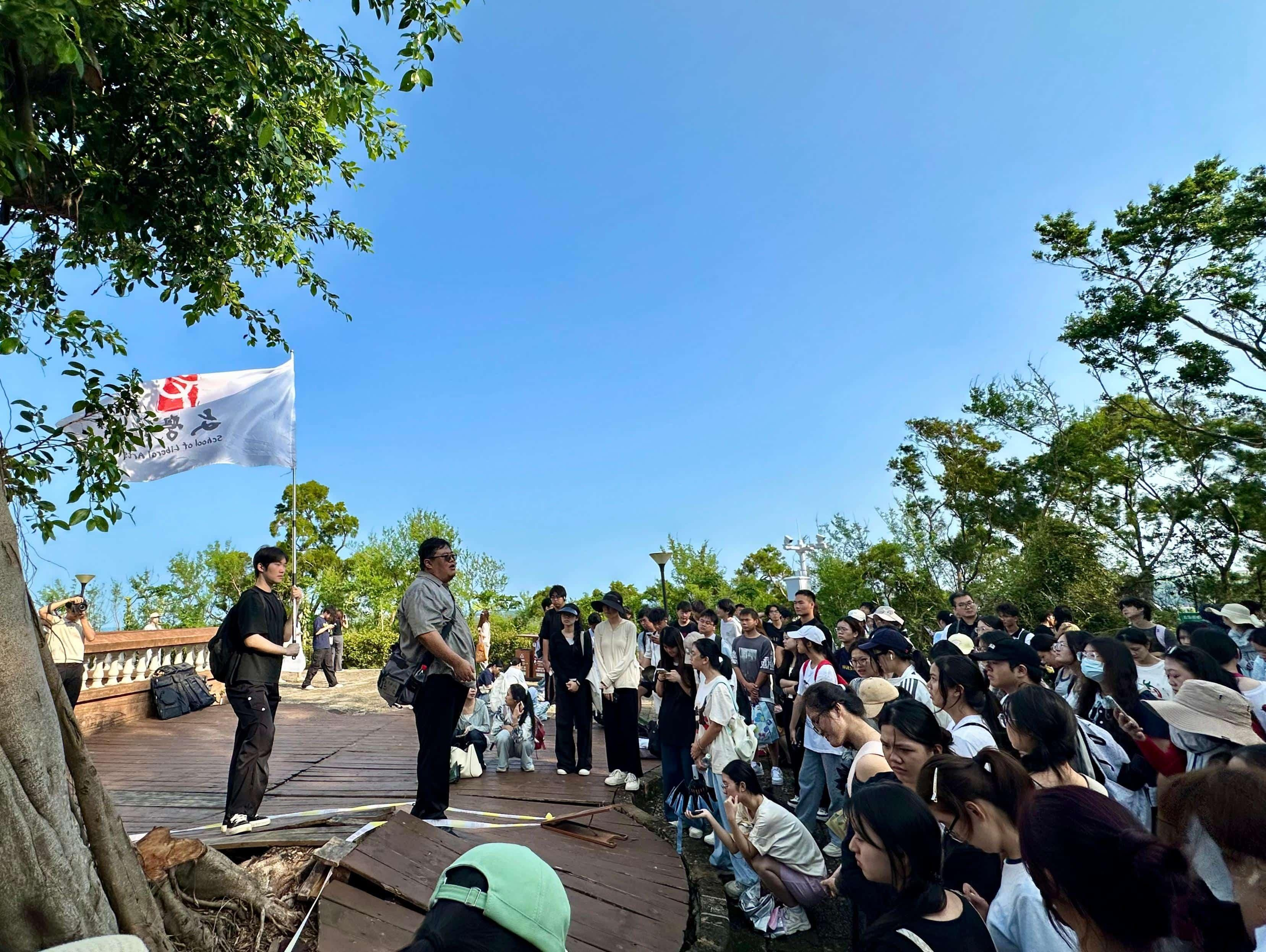 10月20日,师生赴鳄鱼山地质公园,学生一边观看沿途火山岩上布满的海浪冲刷痕迹,一边聆听教师讲解其地貌形成历程与文人墨客对海岛景观的吟咏背景。当学生们站在观景台眺望景观时,课堂所学与眼前实景交融,让文学感知在自然熏陶中愈发深刻,实现自然景观与文学知识的深度联结。