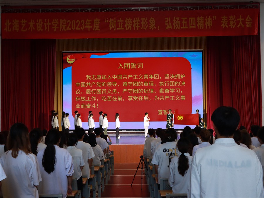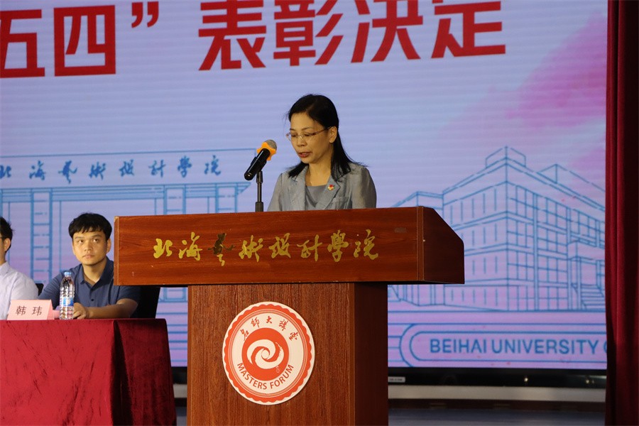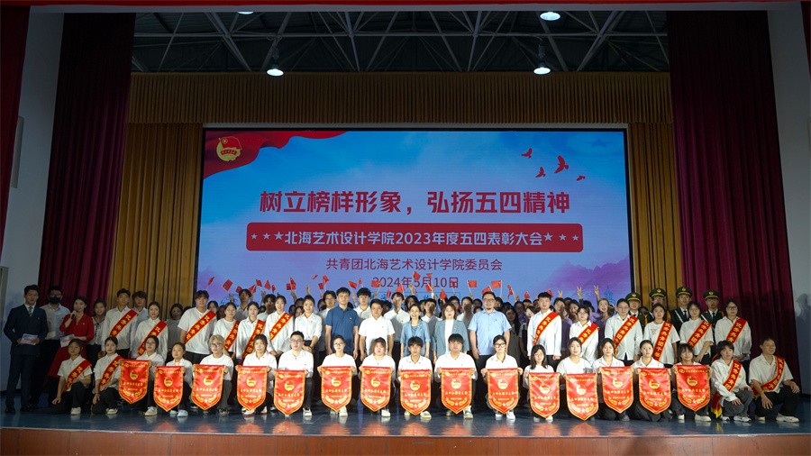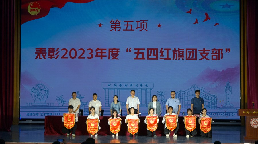 在表彰大会上,党委副书记陈毅华宣读了北海艺术设计学院2023年度“树立榜样形象 弘扬五四精神”五四表彰的决定。表彰建筑与环境艺术学院环境设计专业2106团支部等29个团支部获得“五四红旗团支部”,178名学生获得“优秀团干部”称号,218名学生获得“优秀共青团员”称号。