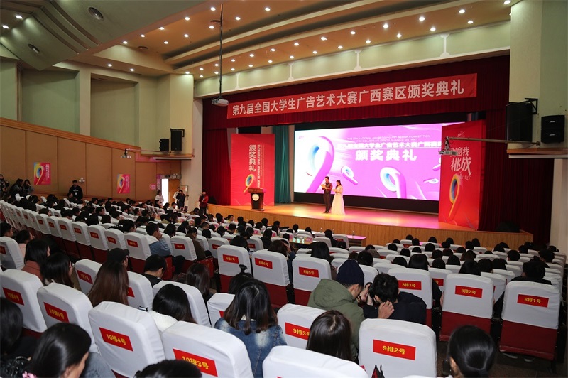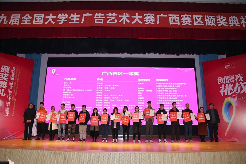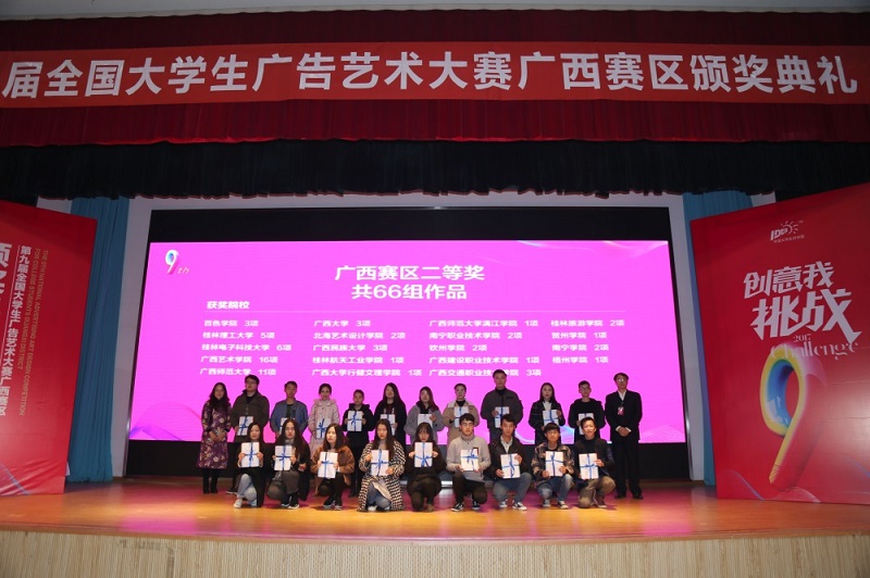 12月23日下午,第九届全国大学生广告艺术大赛广西赛区颁奖典礼在广西师范大学育才校区田家炳教育书院报告厅举行。区内近40所高校的四百余名师生代表齐聚桂林参与颁奖盛会。我校设计学院常务副院长李林平、副院长庞定坤应邀出席颁奖典礼。