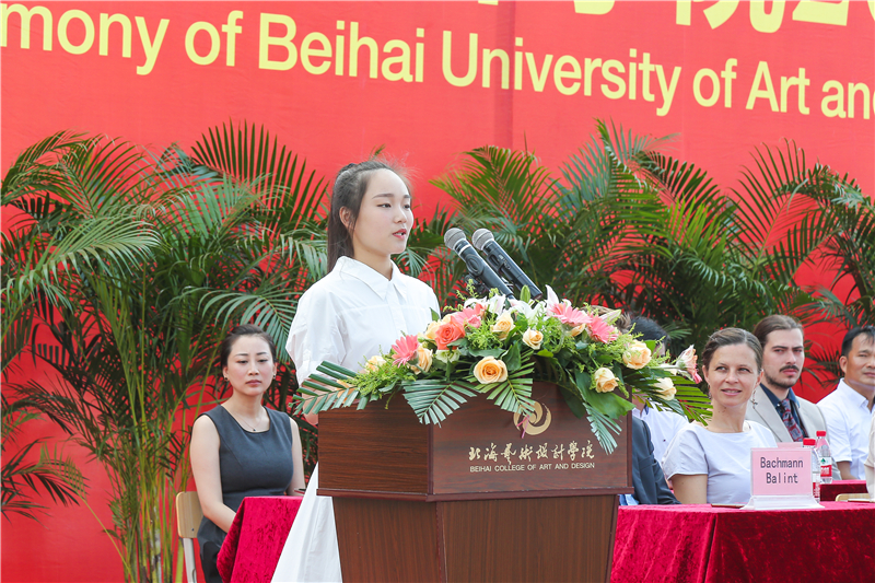 北海市委常委、宣传部部长、副市长黄江在典礼上致辞说,北海中国最美的海滨城市之一,是中国西南地区同时拥有深水海港、全天候机场、高铁、高速公路的城市,北海是古代“海上丝绸之路”的重要始发港,国家历史文化名城。北海市面临的北部湾有丰富的海洋资源,海洋生态环境良好,这里有热情好客的北海人民、有回味无穷的海鲜特产、有独具特色的地方文化。她指出,北海艺术设计学院是一个容纳上万人的校园,到处洋溢着朝气蓬勃,青春活力,希望同学们在新的学习环境中,要时刻牢记时代赋予大家的崇高使命,不断提升自身能力,努力练就扎实本领,脚踏实地、勤奋拼搏,走好大学之路,人生之路,将来成为对国家、社会有贡献的人才。