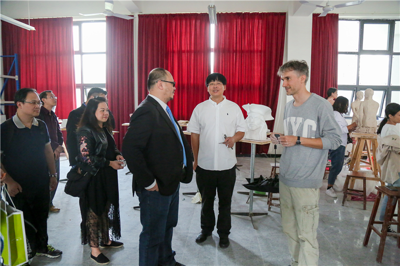 在校领导的陪同下,考察团一行参观了学校的校园文化环境,并对学校的“石刻”文化、办学理念、发展规模等有了深入了解。紧接着,考察团一行走进我校美术学院雕塑专业的课堂进行参观,并与雕塑专业的波波夫老师交流了课堂内容与设计文化。