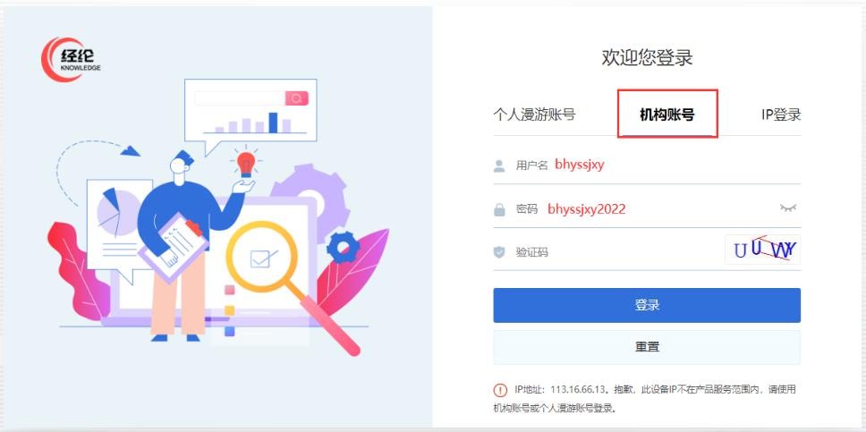 1.因校园网外打开经纶平台网址:http://k.vipslib.com/,无法自动识别登录,如您已注册过个人账号,请使用个人漫游账号登录,如为注册过请选择机构账号登录,并输入学校机构账号:bhyssjxy,密码:bhyssjxy2022,即可登录,登入过后右上角会显示学校名称。