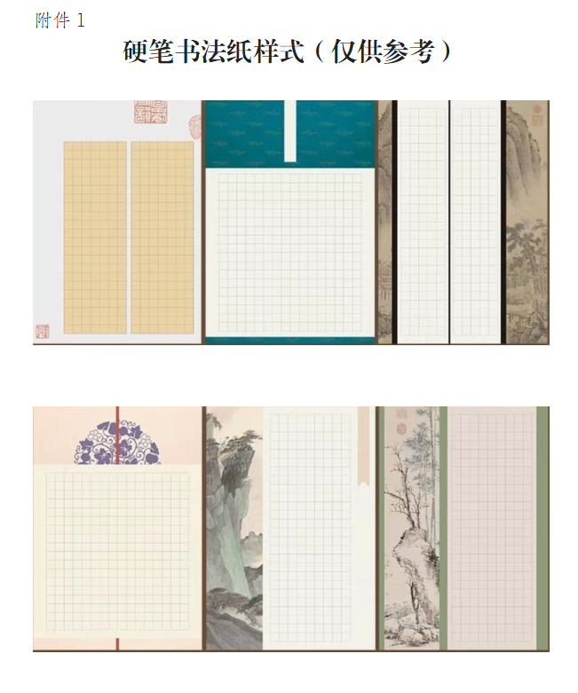 2.硬笔作品:作品采用横写、竖写均可,需确保文本布局合理、笔画规范,画面须无错别字、无漏字、无涂改痕迹,整体卷面需保持整洁干净,书写工整流畅。硬笔书法作品规格:尺寸大小统一采用A3或A4尺寸纸张创作,样式不作要求,自行准备,可参考“硬笔书法纸”(详见附件1)。