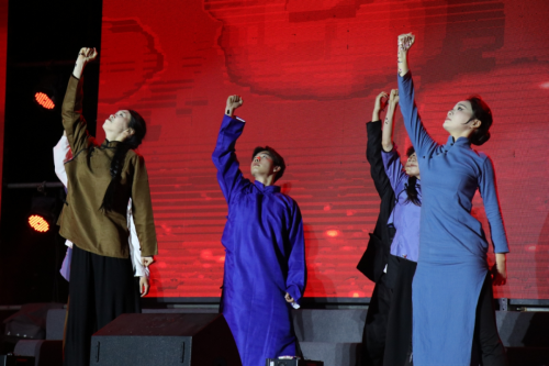 朗诵+舞蹈节目《站在未来的路口》以别开生面的形式登场,激昂的朗诵声中,青年学子的凌云壮志倾泻而出;旋律流转间,或激昂或舒缓的音乐,勾勒出未来的无限可能。