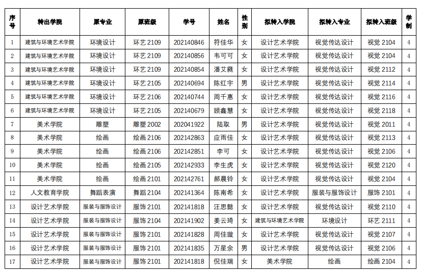 2022年8月18日-25日,我校对符佳华等18名申请转专业同学的名单进行公示,公示期间蔡婧旖同学自愿放弃转专业,其他名单在公示期间没接到有异议的反馈。现同意符佳华等17名同学转入新专业学习。