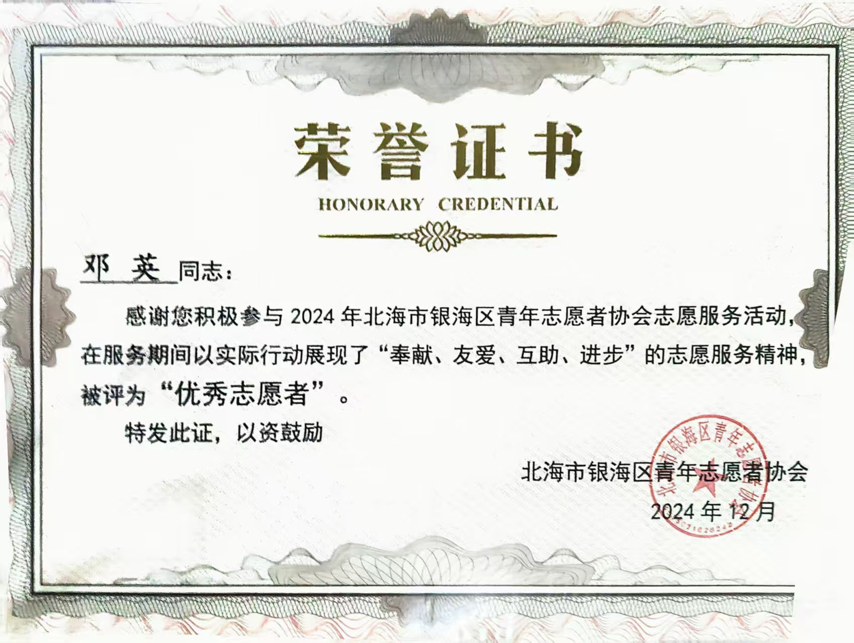 2024年12月 在北海市银海区青年志愿者协会志愿服务活动被评为“优秀志愿者”