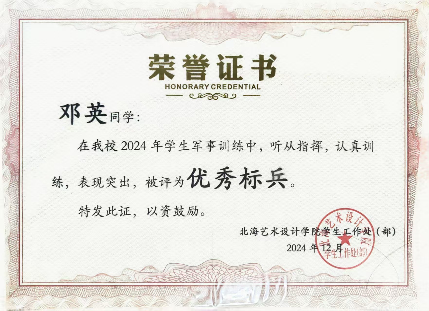 2024年12月 在学生军事训练中被评为“优秀标兵”