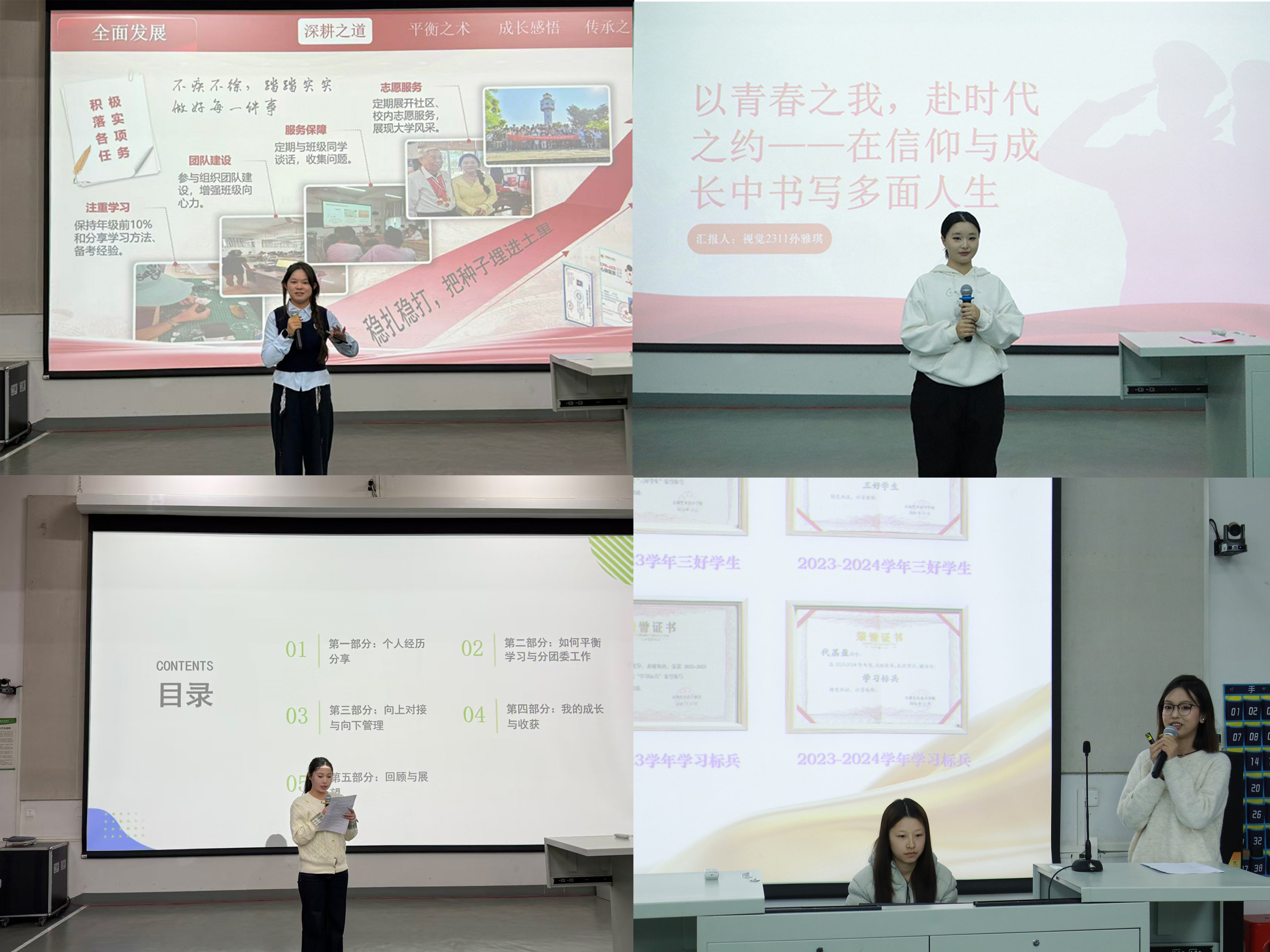 分享会在周程英志老师的寄语中拉开序幕。四位优秀学生代表围绕不同主题,结合自身经历展开分享。