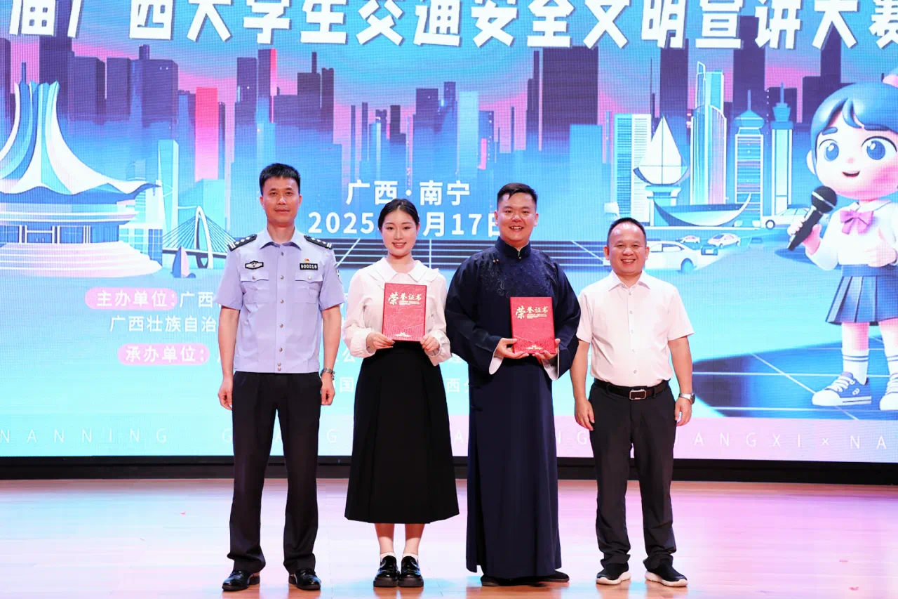 据悉,第二届广西大学生交通安全文明宣讲大赛以“文明交通,携手共创”为主题,旨在深化高校交通安全教育,提升青年学生交通安全意识与责任担当。大赛聚焦《中华人民共和国道路交通安全法》,围绕典型交通违法、规则意识、安全防护等内容,鼓励创新宣讲形式,传播文明交通理念。我校参赛团队紧扣赛事主题,深入挖掘交通安全知识与地方特色文化融合点。该宣讲分为四个部分:辨电动车牌照属性避无证驾驶、示范头盔正确佩戴讲清防护要点、模拟大货车盲区演示避险距离、快板口诀“蓝牌无照、头盔必戴、货车远避”等,场景化展现交规知识,凭借原创性、实用性优势,在众多参赛作品中脱颖而出,荣获佳绩。