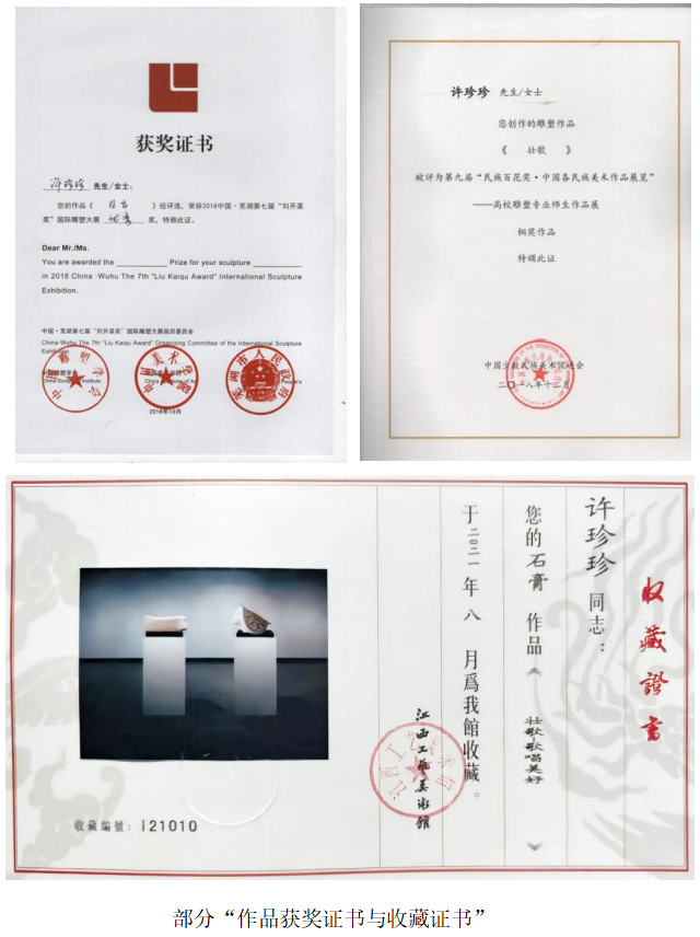 衷情科研、成果斐然,许珍珍老师对科研探索一直保有极大的热情,默默付出终有美好回报。自入职以来,她主持了1项省级A类教改课题《广西民族非遗文化背景下<综合材料、雕塑创作>课程思政教学创新与实践》项目编号:2022JGA402;主持了2项市厅级课题:广西高校中青年教师科研基础能力提升项目《广西壮族铜鼓纹饰的当代艺术形态研究与应用》项目编号:2022KY1804、广西民办教育科学规划课题《民办应用型本科院校<公共雕塑>课程教学改革与实践研究》项目编号:2022MBZX63;个人发表教科研论文4篇、作品10余件。辛勤的探索,让她创作了大量的雕塑艺术作品。一路走来,她的作品入选了众多各级各类赛事,不乏有国内雕塑艺术方向的国展。她的个人作品以奇异的造型、天马行空的创意、别致的趣味捕获了广大师生的欢心,也为众多社会收藏人士和机构所追逐,如郑州雕塑公园、芜湖国际雕塑公园、福州市政府、云南西畴县政府、山东潍坊市、江西省工艺美术馆、德龙钢铁集团、华为等,均有收藏其作品。