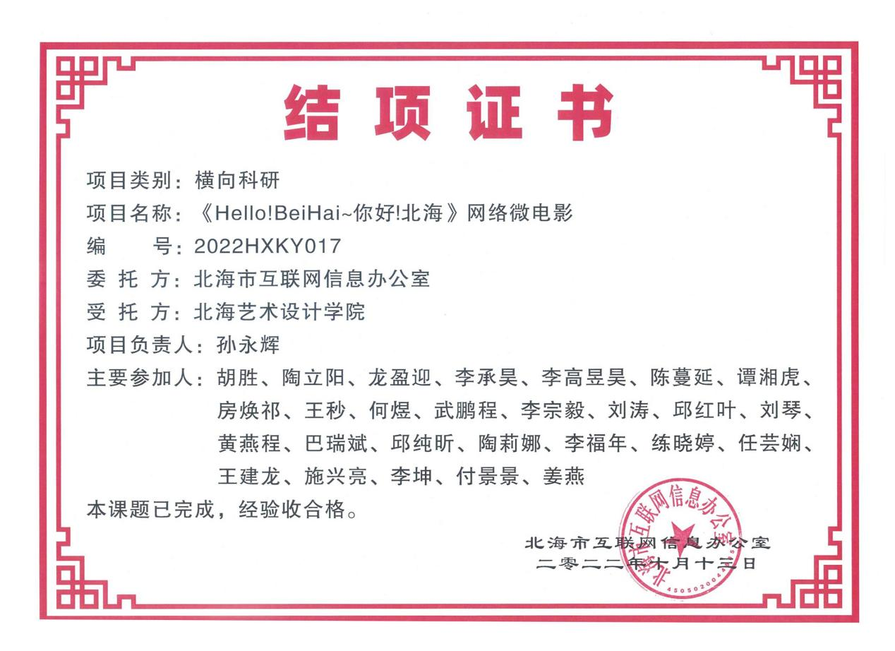 勤耕科研,厚积薄发,教研互动,始终如一,收获满满。从教以来,孙永辉老师经过多年沉淀,在科研方面积攒颇丰,主持和参加各级各类课题18项。例如:2020年,主持完成广西高校中青年教师科研基础能力提升项目《基于海洋文化背景下动画产业的创新与发展研究》,项目编号:2020KY65014;2021年,主持在研北海艺术设计学院2021年度思政项目《课程思政融入数媒专业项目化教学的实践研究——以网络电影“唱给海的歌”为例》,项目编号:2021BYSZYJ09;2023年,主持在研广西高校中青年教师科研基础能力提升项目《广西壮族题材动画艺术创作研究——以《勇敢的阿牛哥》为例》,项目编号:2023KY1884;参与项目有14项,如:2021年,参与广西教育科学规划2021年度民办高等教育研究专项课题《广西民办高等教育质量保障和提升机制研究》,项目编号:2021ZJY754;2022年,参与广西高校中青年教师科研基础能力提升项目《基于北海疍家文化元素的绘画创作与应用研究》,项目编号:2022KY1808等等。