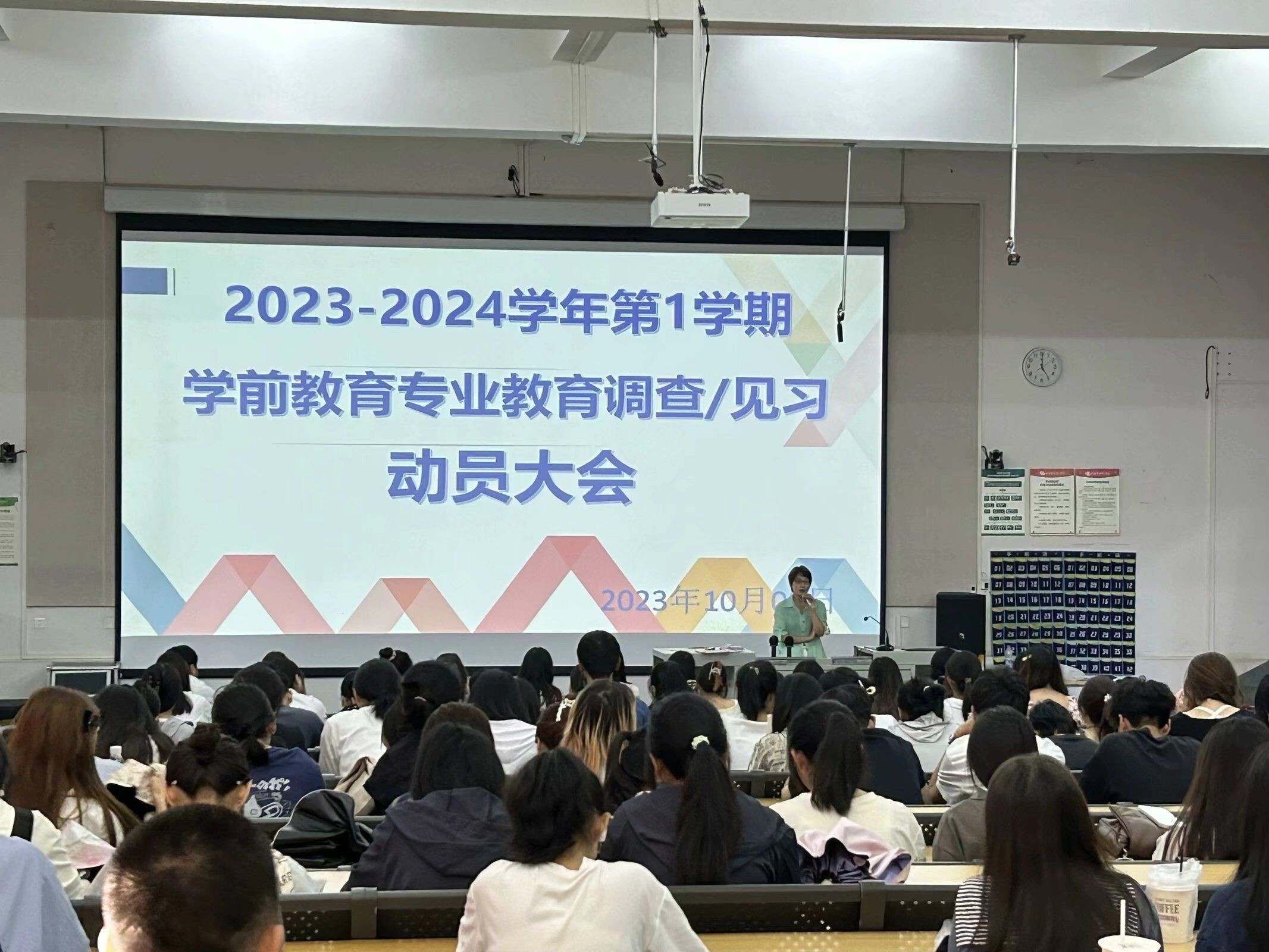 10月9日,学前教育教研室召集2021级、2022级和2023级学前教育专业的全体学生在公德楼107教室进行2023-2024学年第一学期学前教育专业教育调查/见习动员大会,大会由冯小霞老师主持。人文教育学院李谦副院长在会上发表讲话,提醒同学们要牢固树立安全意识,在教育实践中高度重视幼儿园小朋友以及个人的安全,指出,同学们要严格遵守学校和幼儿园的各项规章制度,以严谨求学的态度对待此次教育实践。学前教育教研室主任蒙剑英老师强调要以积极的态度面对教育调查、教育见习,由于专业水平、视野、见识等的不同,希望同学们从不同的角度进行观察、取得收获。冯小霞老师向同学们说明了教育见习和教育调查的各项安排,强调实践过程中的仪容仪表、礼貌礼仪等注意事项。