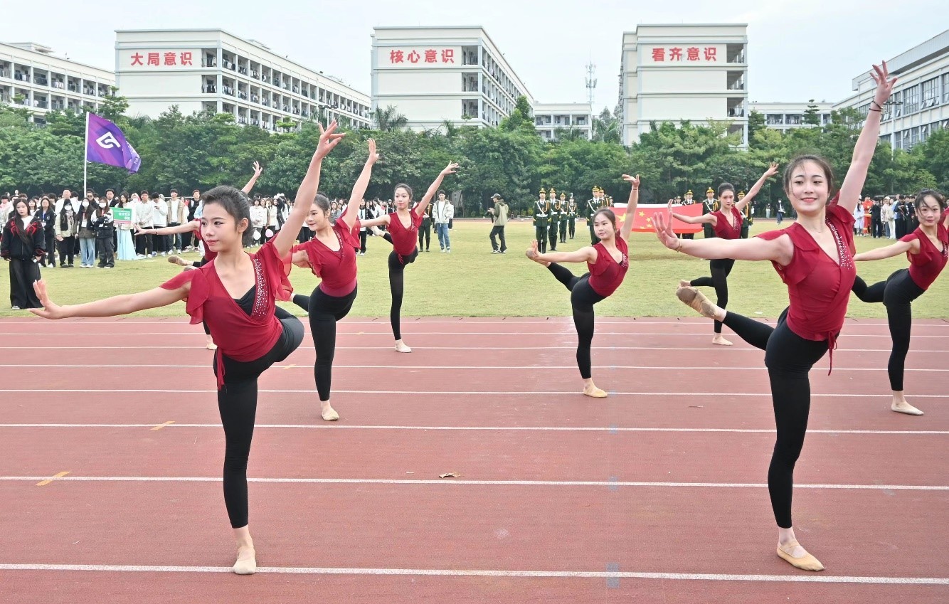 伴着昂扬的运动员进行曲,人文教育学院代表方队步伐整齐地走向主席台,并在主席台前呈现精彩表演。他们挥舞手臂,昂首阔步,气宇轩昂,意气风发,展现出蓬勃的青春风貌。女生婀娜多姿,男生铿锵有力,配合默契,一曲舞毕,全场掌声雷动。