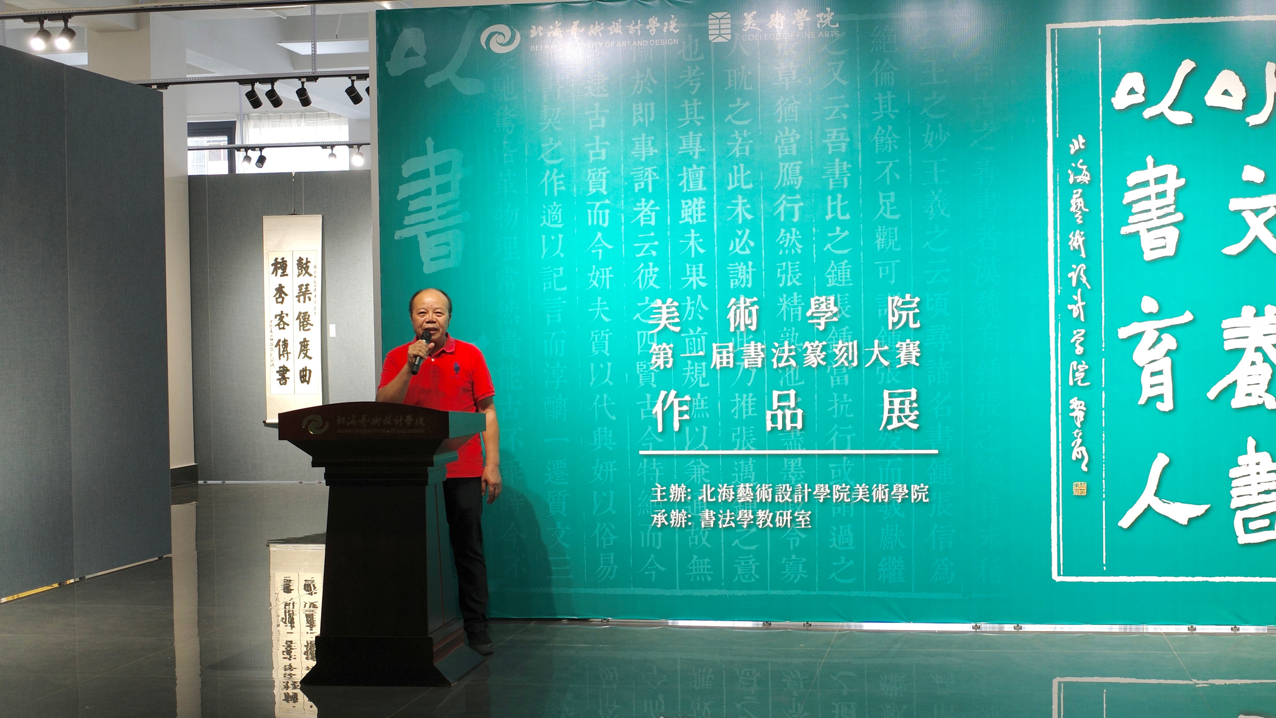 2024年4月19日,于北海艺术设计学院艺德楼举行“以文养书,以书育人”美术学院第一届书法篆刻大赛作品展开幕仪式。本次活动由书法学教研室主任苏乃从主持,书法学专业学科带头人黎东明教授、书法学外聘教授邓建华、万应均以及2022、2023级书法学全体师生参与,并邀请美术学院常务副院长龚为、美术学院党总支副书记鲁明阳、美术学院学工办主任林昌华。