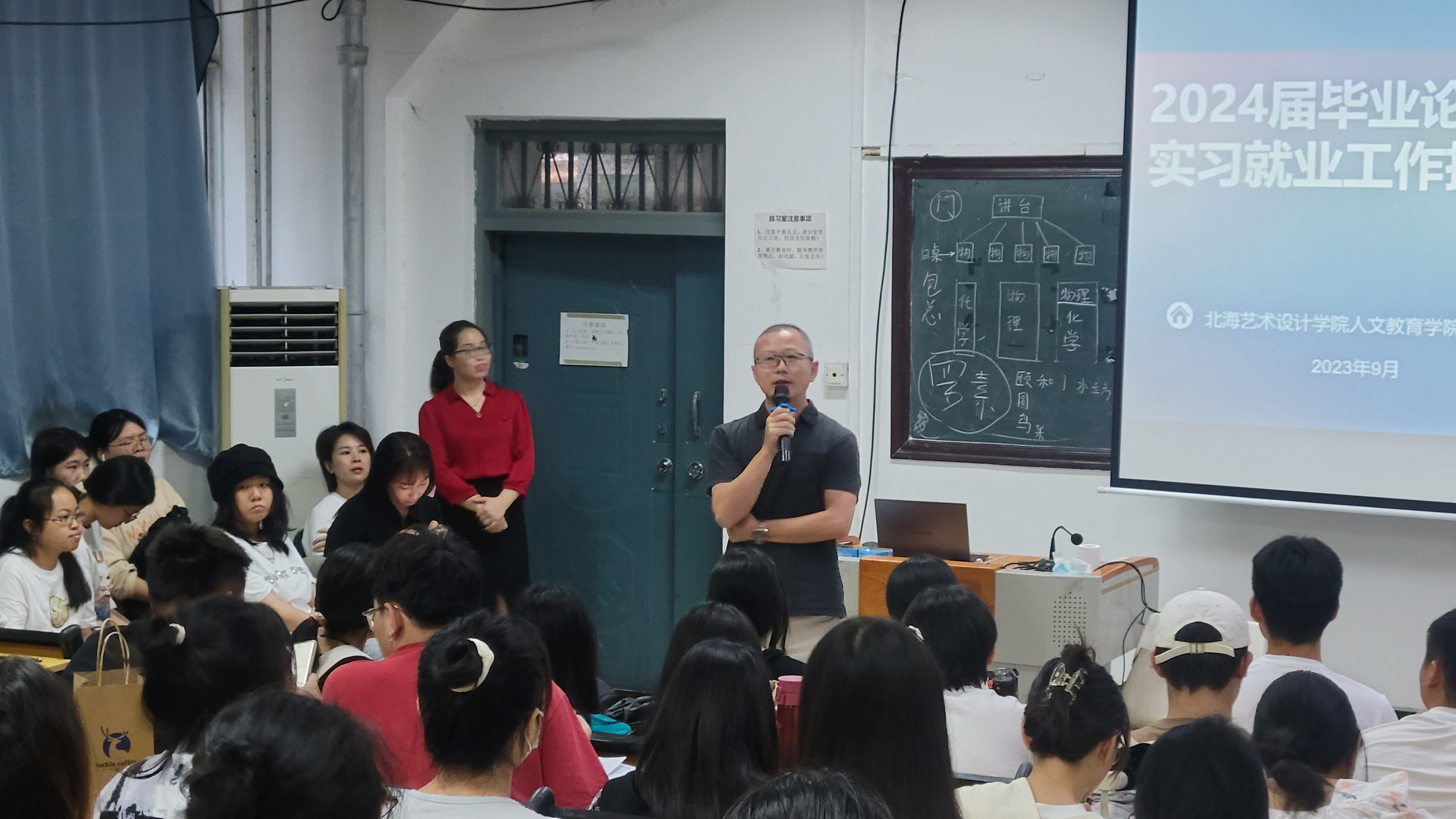 为切实做好我院2024届本科生论文指导、毕业实习与就业工作,调动学生毕业论文写作、实习与就业的积极性,9月14日,我院召开2024届毕业论文、实习就业工作动员大会。北海艺术设计学院总督学王斌、人文教育学院院长熊秀峰、副院长梁镨文出席此次动员会,人文教育学院2024届全体毕业生参加本次动员大会。会议由学院梁镨文副院长主持。