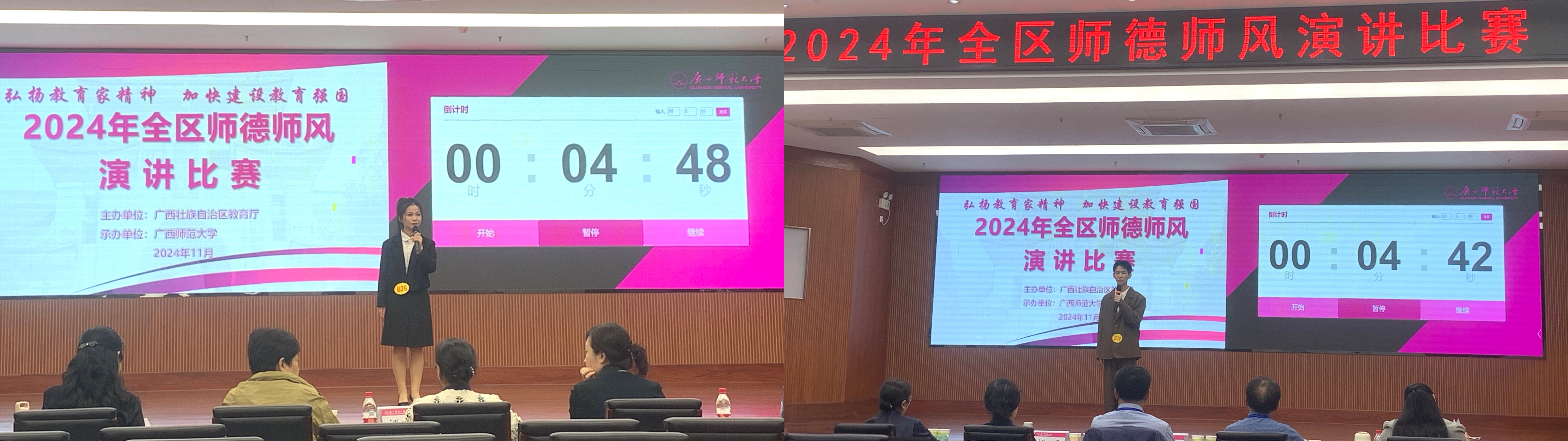 11月16日至11月17日,由广西壮族自治区教育厅主办的2024年师德师风演讲比赛在广西师范大学育才校区举行,本次演讲比赛以“弘扬教育家精神,加快建设教育强国”为主题。我校教育学院学前教育专业2301班马杨燕、蔡庭柯参赛,其中马杨燕同学凭借稳定发挥,在全区66名选手中脱颖而出,喜获高校师范生组三等奖的佳绩。