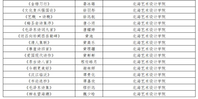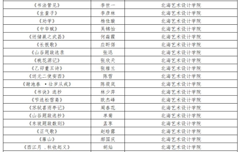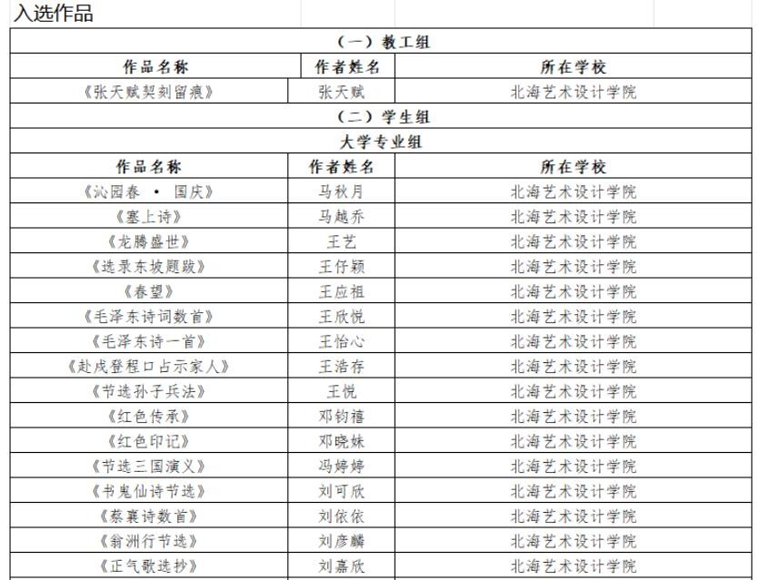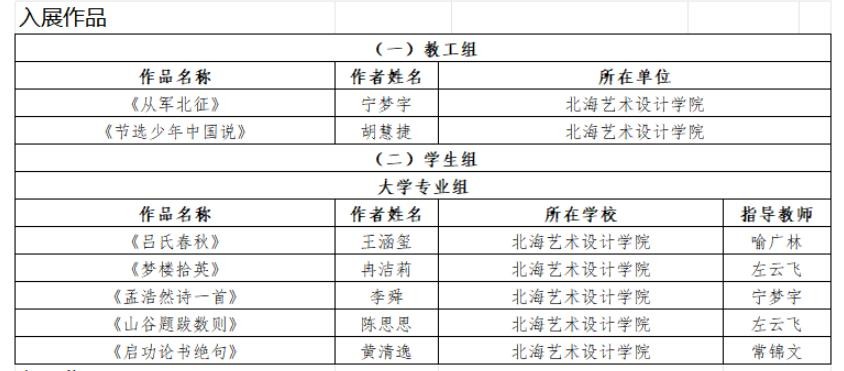 近日,“园丁杯”广西教育系统第届书法篆刻作品展结果公布,我校书法学院教师及学生共计58人入围“园丁杯”广西教育系统第八届书法篆刻作品展,其中书法学专业教师宁梦宇、胡慧捷5名同学入展本次作品展张天赋老师及50名学生入选本次作品展