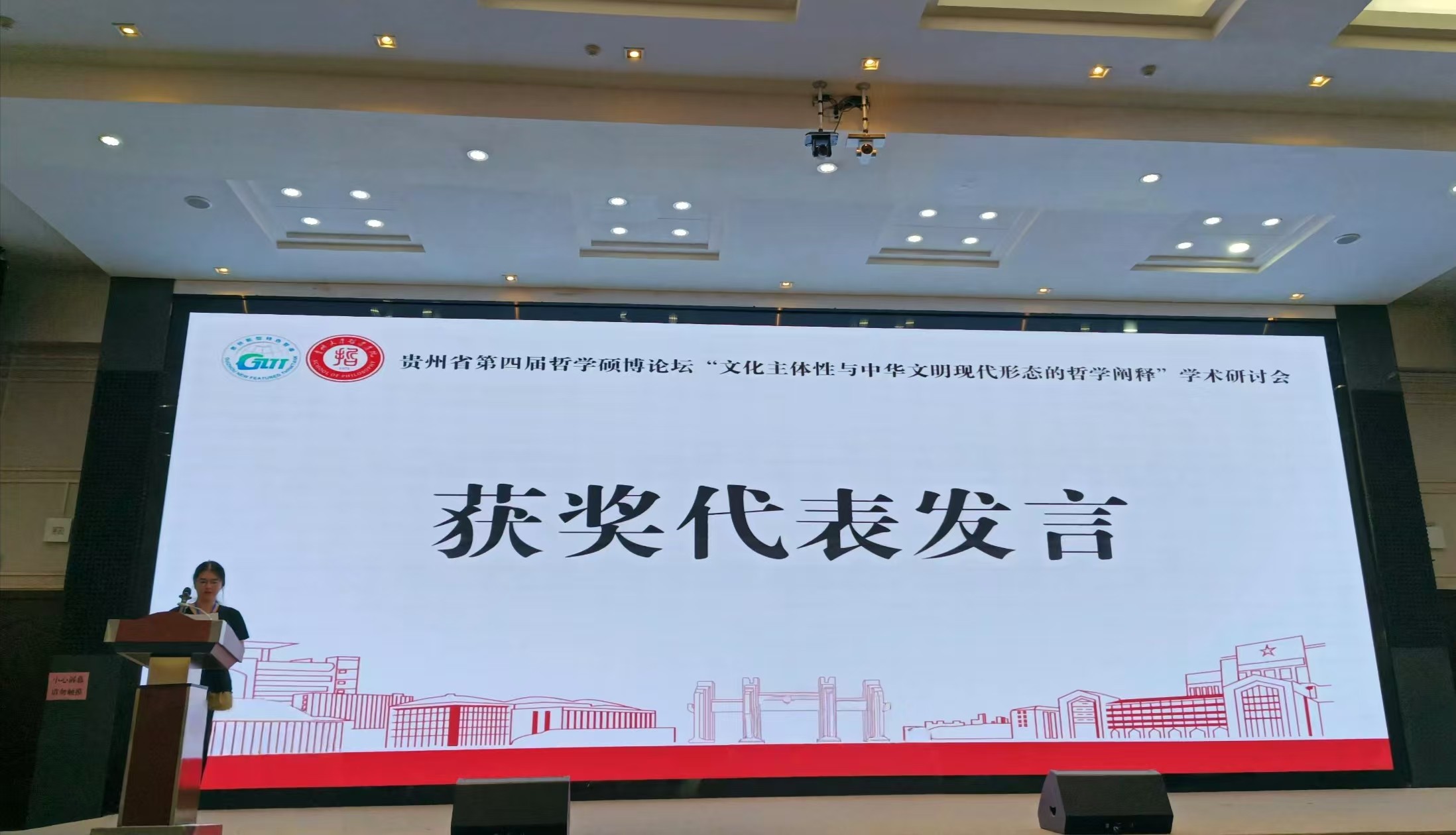 近日,由贵州省哲学学会、贵州大学研究生院、贵州大学人文社科处联合主办,贵州大学哲学学院、中国共产党人“心学”与推进党的建设新的伟大工程高端智库、贵州大学出版社联合承办的“贵州省第四届哲学硕博论坛——‘文化主体性与中华文明现代形态的哲学阐释’学术研讨会”在贵州大学召开。我校哲学学院学生郝悦、常桂邦、黄泽元、罗莹滟参加了此次论坛。参会论文荣获二等奖1项,优秀论文3篇,充分展现了学子学术潜力和学校在人才培养上的育人成果。