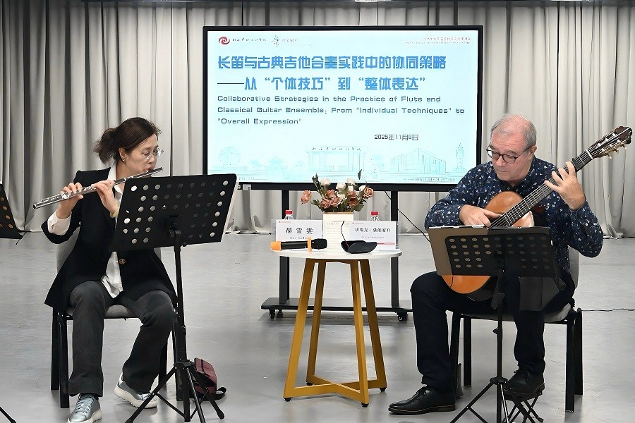 2025年11月5日,法国著名古典吉他演奏家埃瑞克·佛朗塞利与旅法长笛演奏家郝雪雯女士莅临北海艺术设计学院,以“长笛与吉他合奏实践中的协同策略——从个体技巧到整体表达”为主题,为师生带来了一场兼具专业深度与艺术魅力的交流研讨。