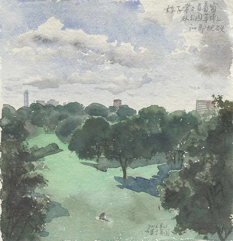 《妙子常常看着窗外公园草坪上的那块石碑》·21x20cm· 水彩· 2016年
