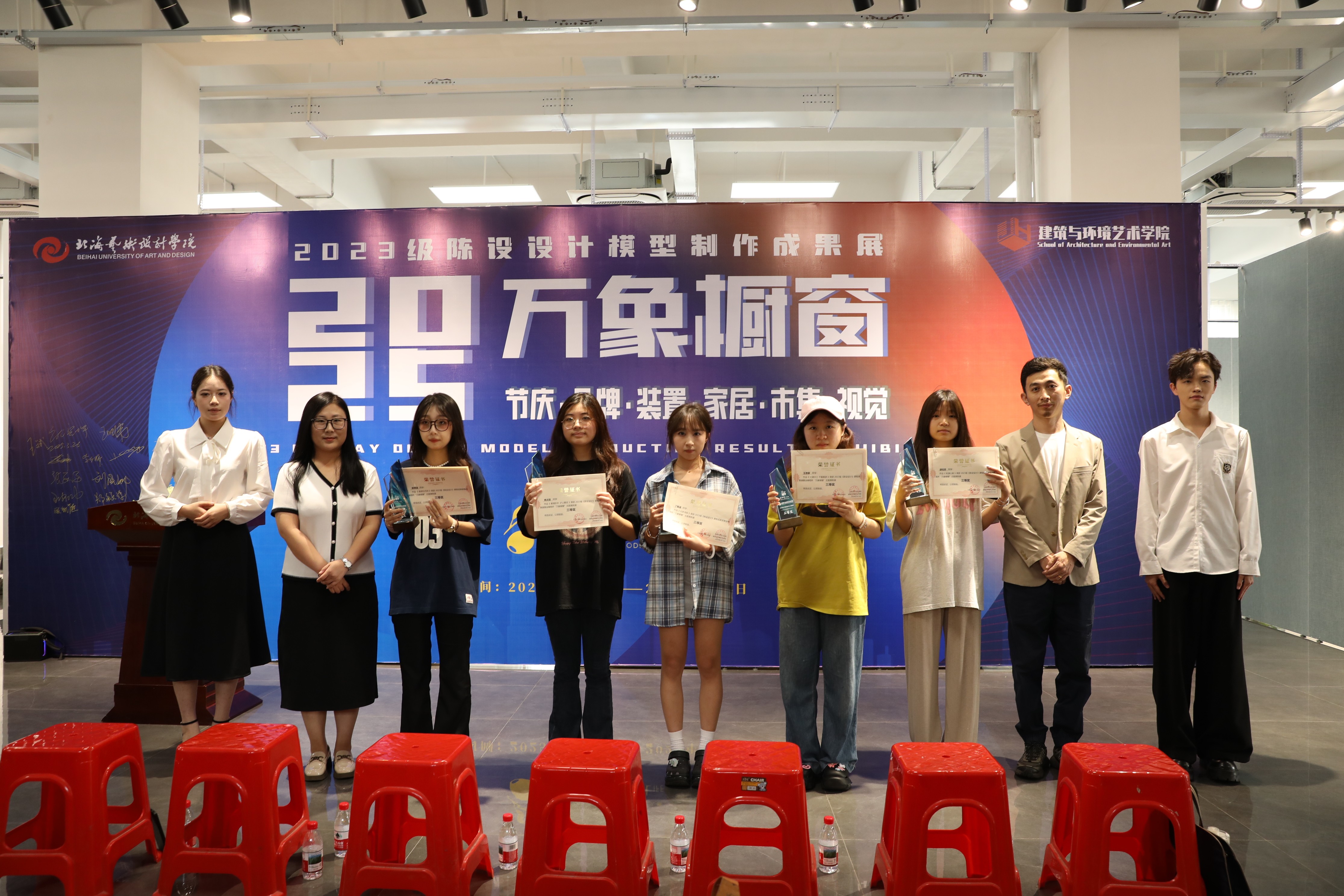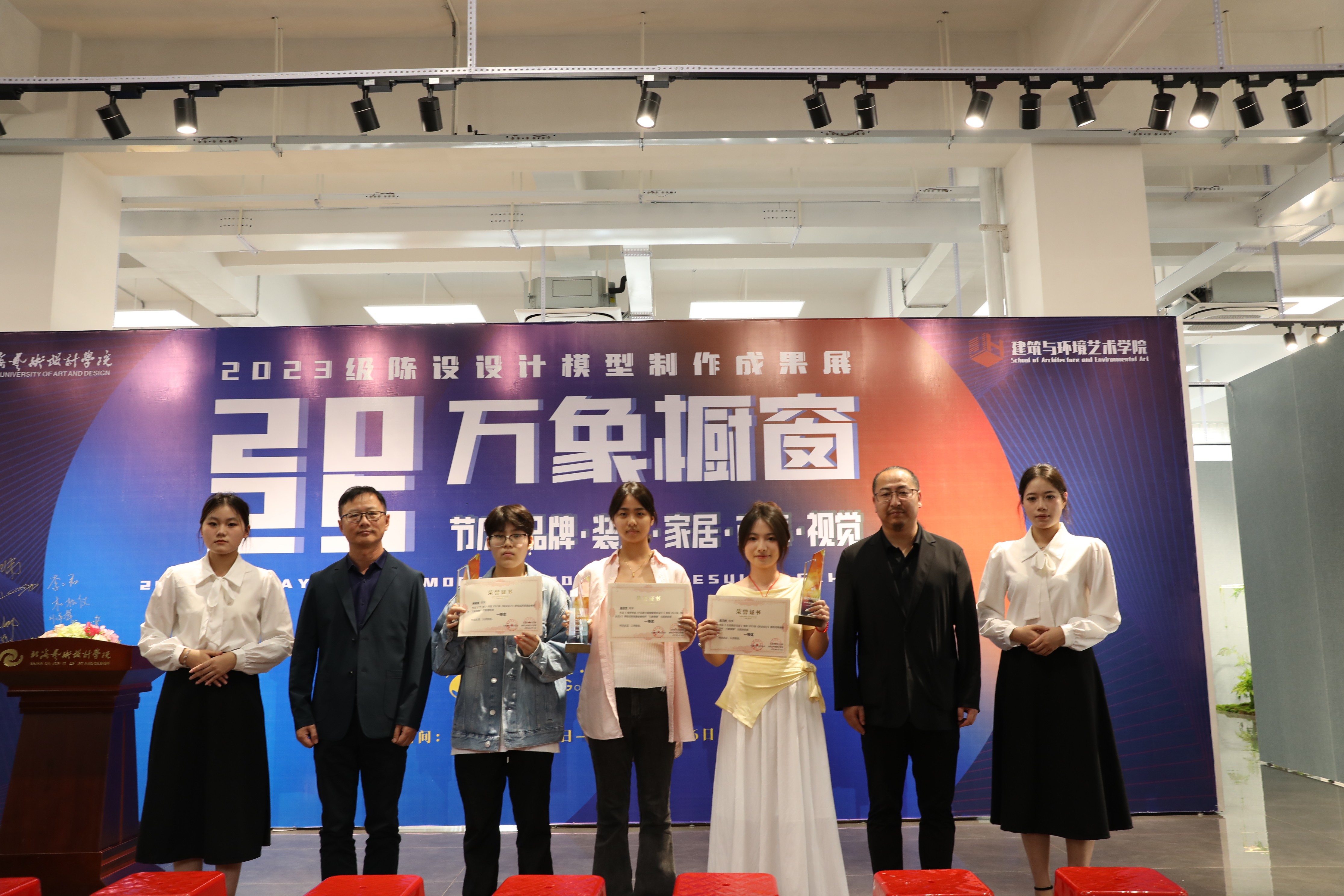 此次展览通过对作品主题立意、完整度、做工、综合材料运用等方面进行综合考量,评测出优秀奖21项,三等奖10项,二等奖6项和一等奖3项。课程组为等级奖项获奖同学制作了精美的奖杯和证书。在充满激情和热烈的氛围中,出席领导、嘉宾现场为获奖学生颁发了荣誉证书。