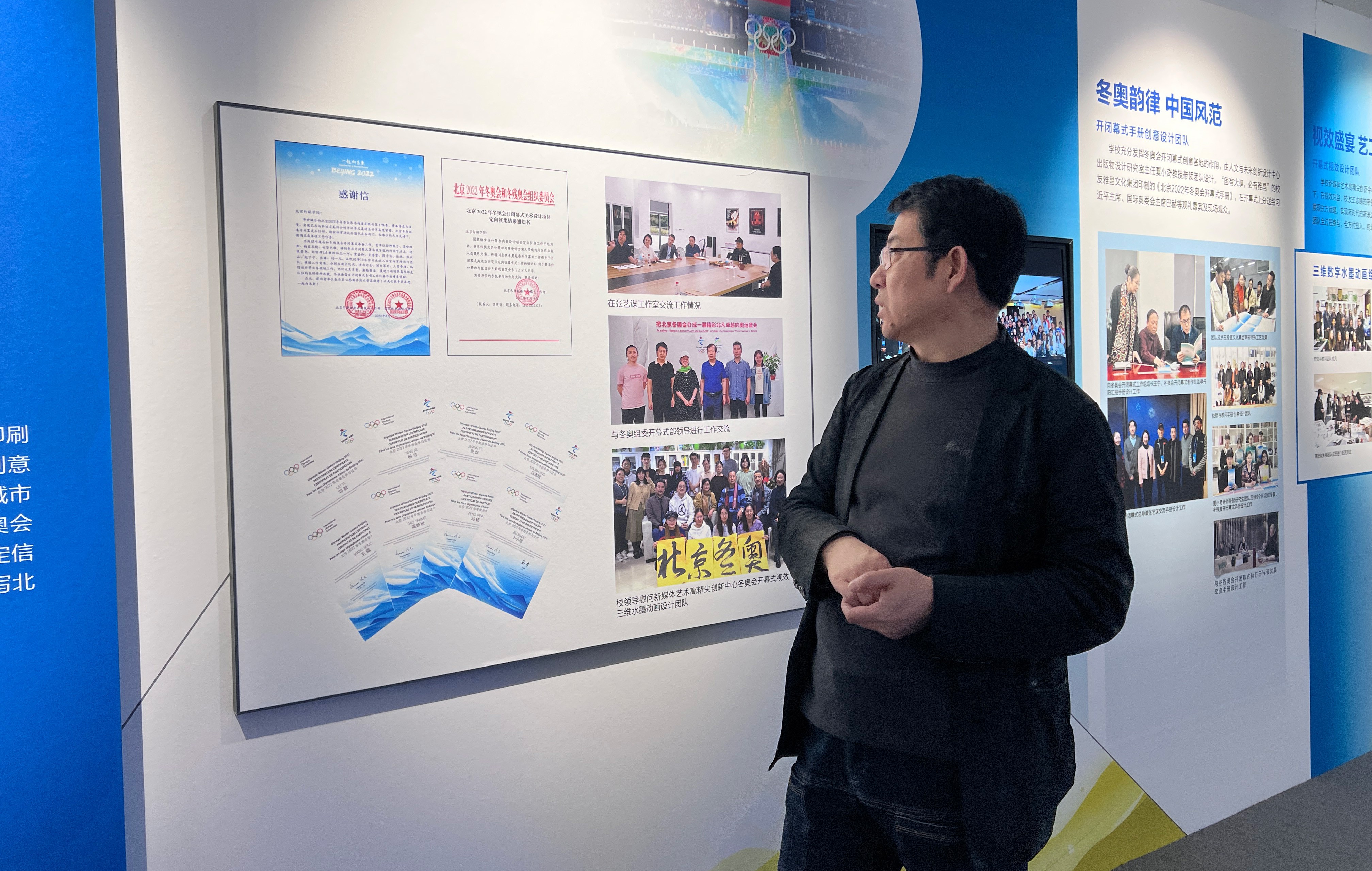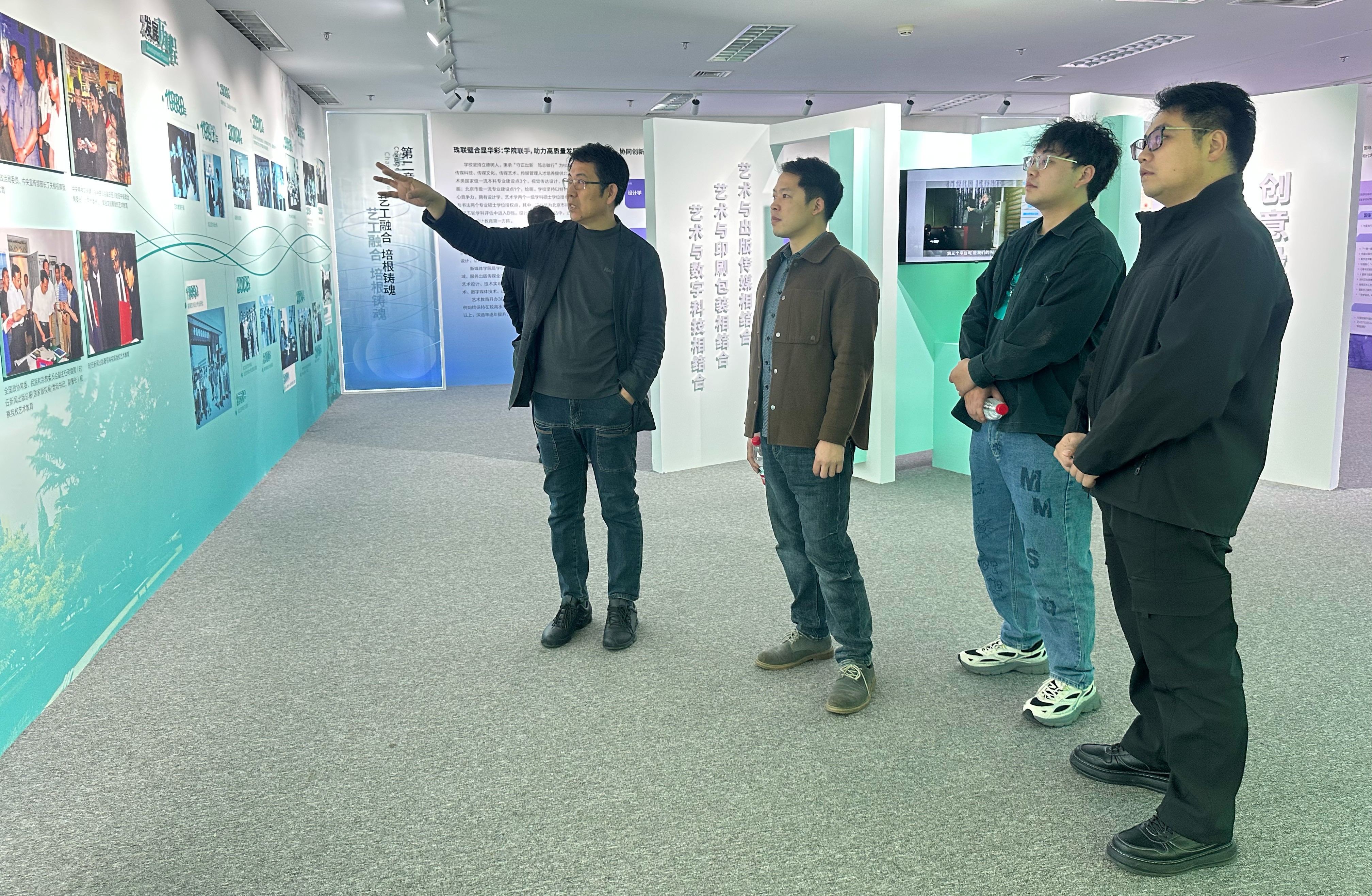 在设计艺术学院党委书记史民峰教授的带领下,调研组首先参观了该校重大设计项目专题展及艺术教育成果展。史民峰教授详细介绍了该校服务国家战略需求、深耕艺术设计领域的实践成果,重点展示了师生团队参与2008年北京奥运会、2022年北京冬奥会视觉设计项目的经典案例,凸显了该校传承弘扬印刷文明,创新发展出版文化的办学使命。调研组对北京印刷学院将专业建设与国家重大活动紧密结合的创新模式表示高度赞赏,并就跨学科协作、产教融合机制展开深入探讨。