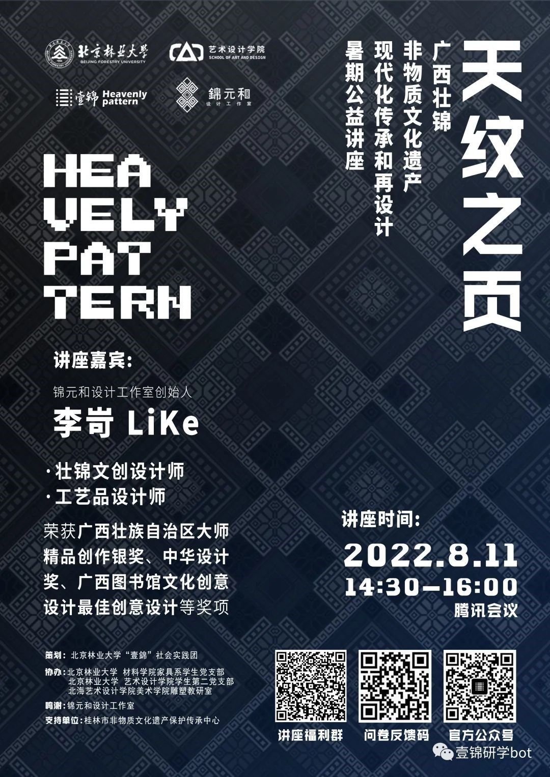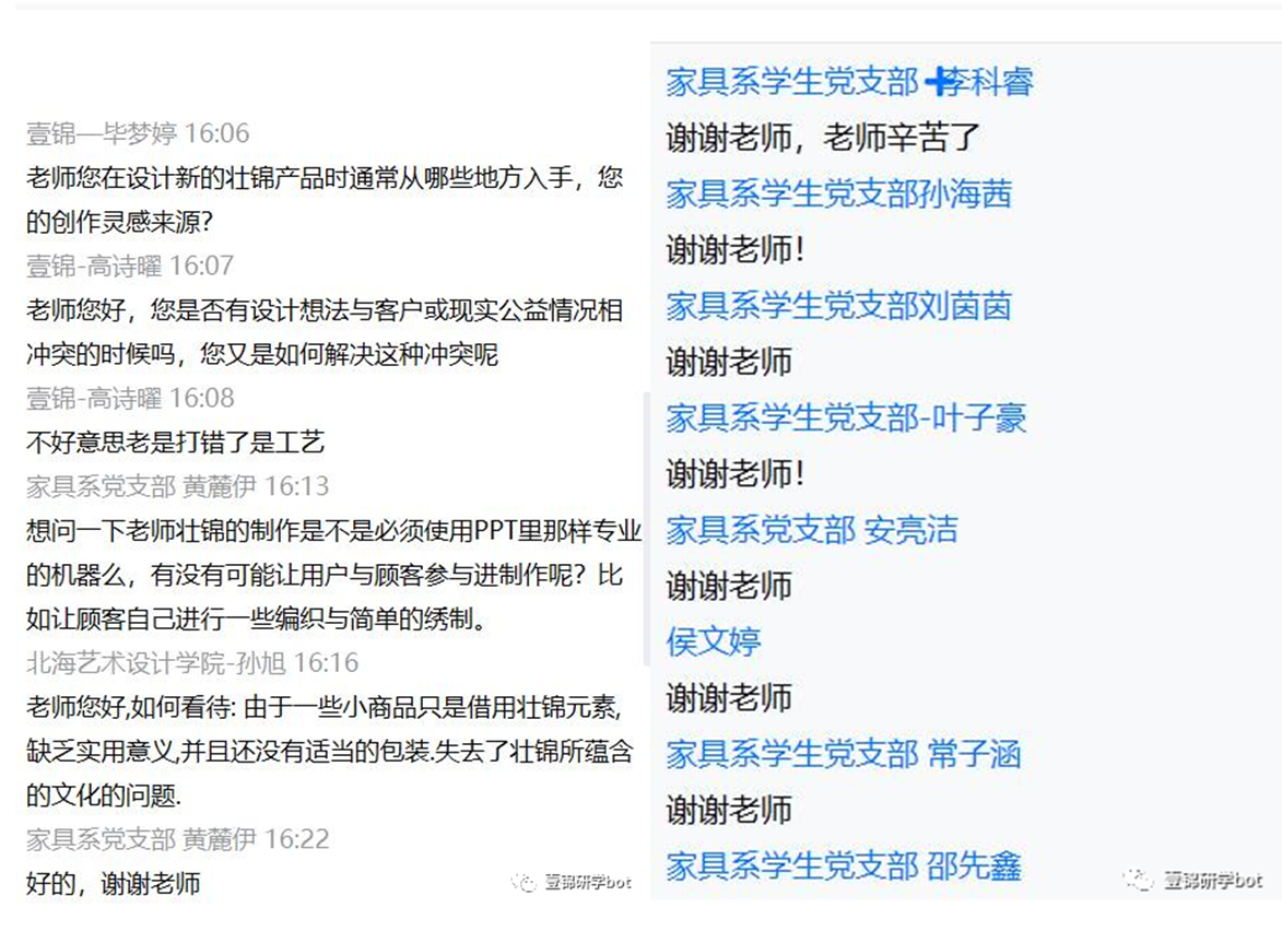 811日,美术学院雕塑专业与北京林业大学艺术设计学院本科第二学生党支部、材料学院家具学生党支部开展联建活动。活动由锦元和设计工作室创始人、壮锦文创设计师、工艺品设计师李岢老师作为主讲,展开题为《壮锦现代化传承和再设计》的讲座,本次活动以腾讯会议为平台,由桂林市非物质文化遗产保护和传承中心支持举办。