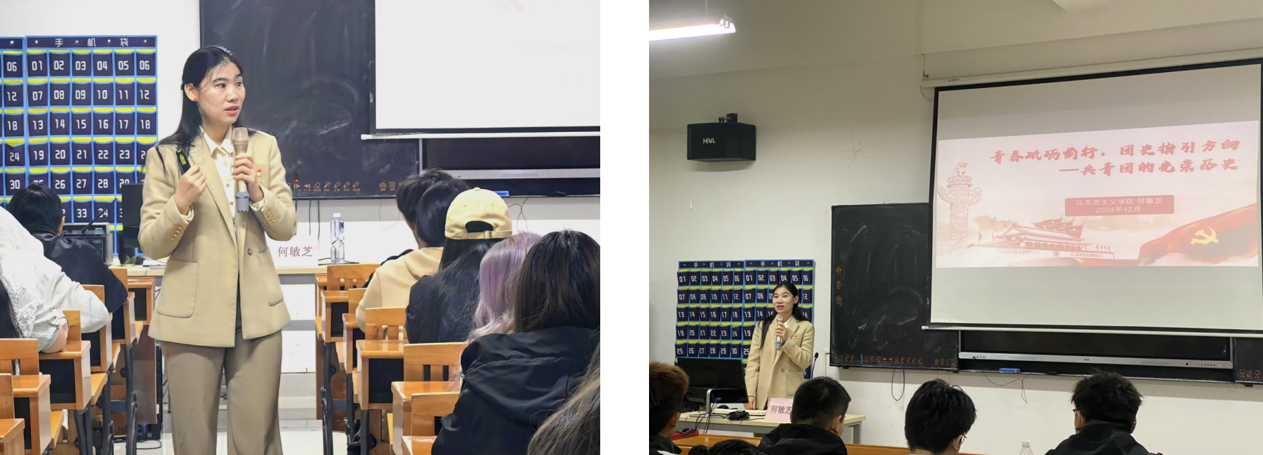 随后,马克思主义学院何敏芝老师详细讲述了中国共青团的发展历程,强调马克思主义思想是我们立党立国、兴党兴国的根本指导思想,并对青年大学生们在日后的实践工作中做出指导,为同学们学习及工作实践指明了奋斗方向,鼓励同学们开阔思维、大胆创新。