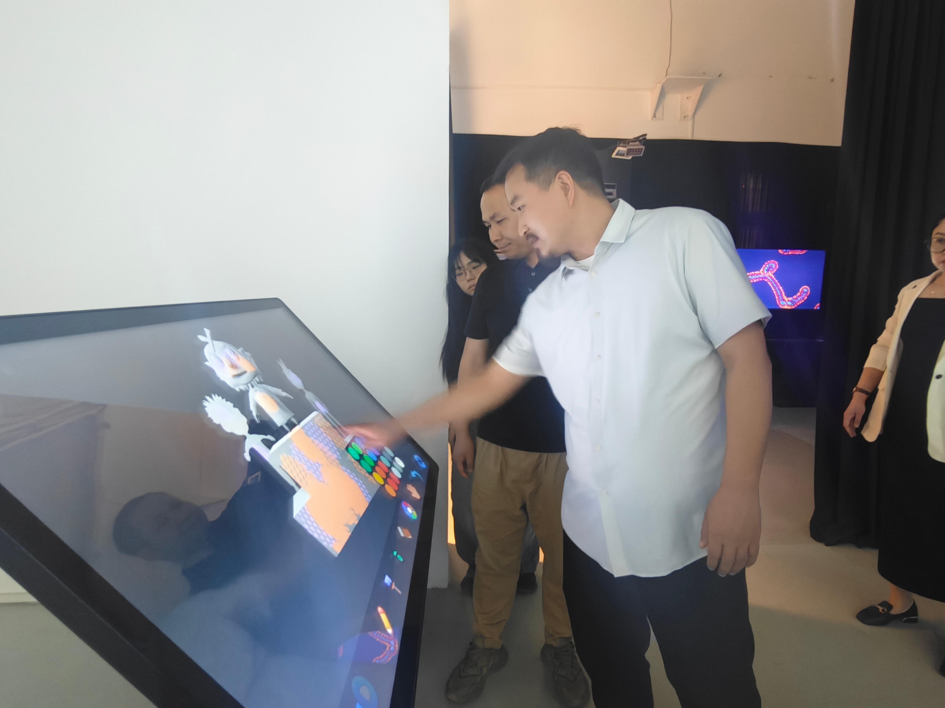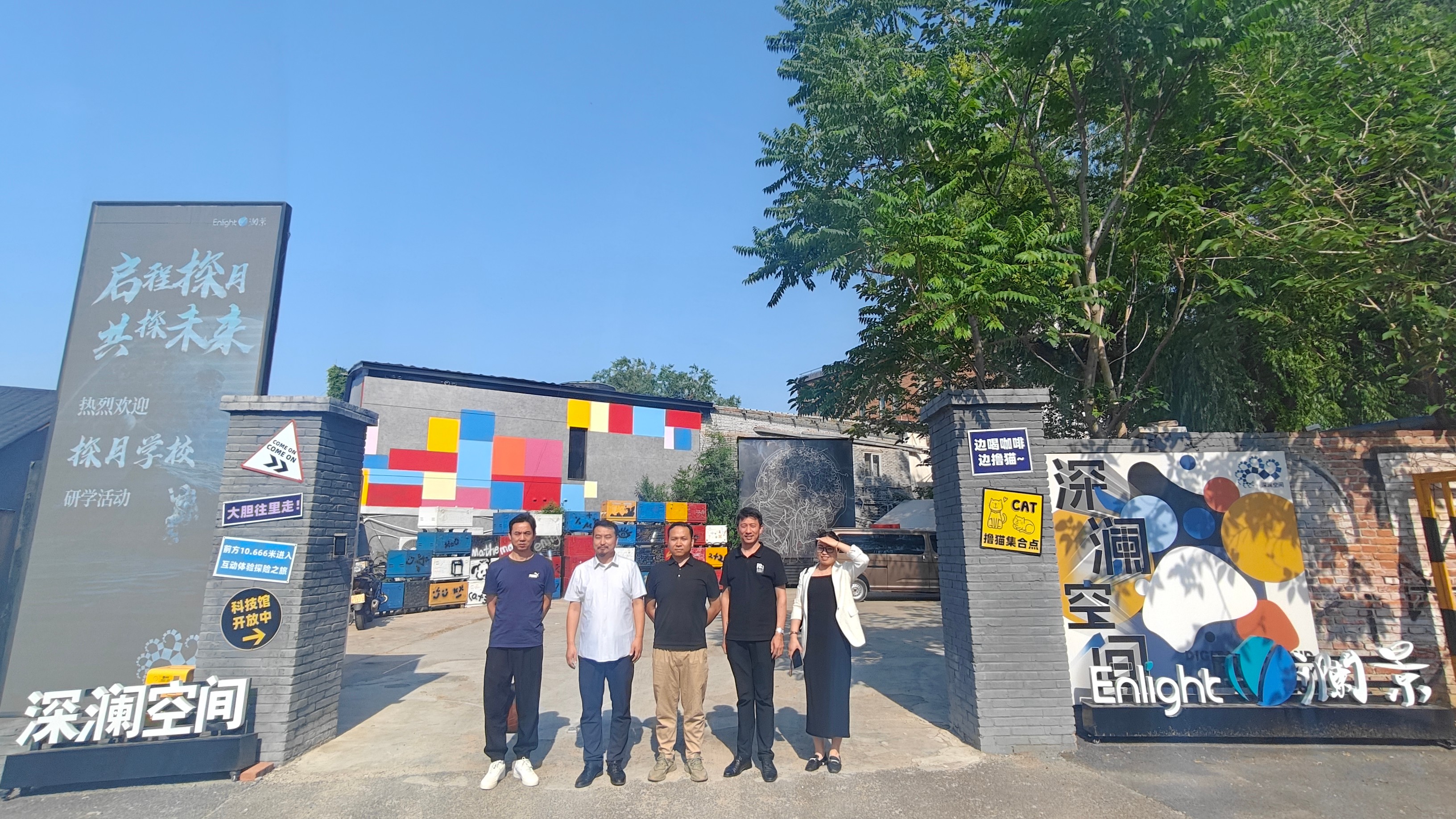 随后,团队前往北京澜景科技有限公司。在公司负责人杨鸿的带领下,团队进入深澜数字艺术科技馆,参观了该公司基于“hecoos全域制作”和“hecoos xR/VP虚拟制作”的实训环境,同时负责人详细介绍了hecoos xR/VP AI无穿戴动捕中虚拟阴影、人体节点追踪互动、虚拟物体碰撞、自动机位切换、无限远景拓展等技术,让团队深度感受了该公司在人工智能时代科技与艺术相融合的共创成果。这一参观体验为学院在 AI + 设计教学改革方面提供了直观的示范。