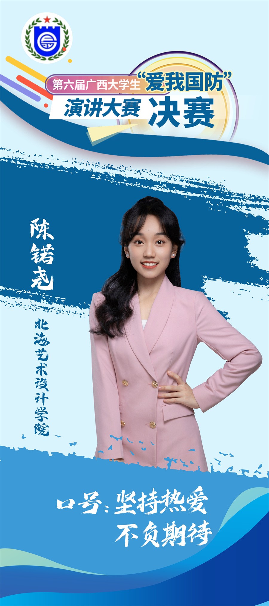 近日,由广西壮族自治区党委宣传部、自治区全民国防教育办公室联合自治区教育厅、自治区征兵办、广西军区政治工作局主办的第六届广西大学生“爱我国防”演讲大赛决赛在南宁举行。我校动画与传媒学院播音与主持艺术专业2101班陈锘尧代表学校参赛,并在众多选手中脱颖而出,荣获三等奖。
