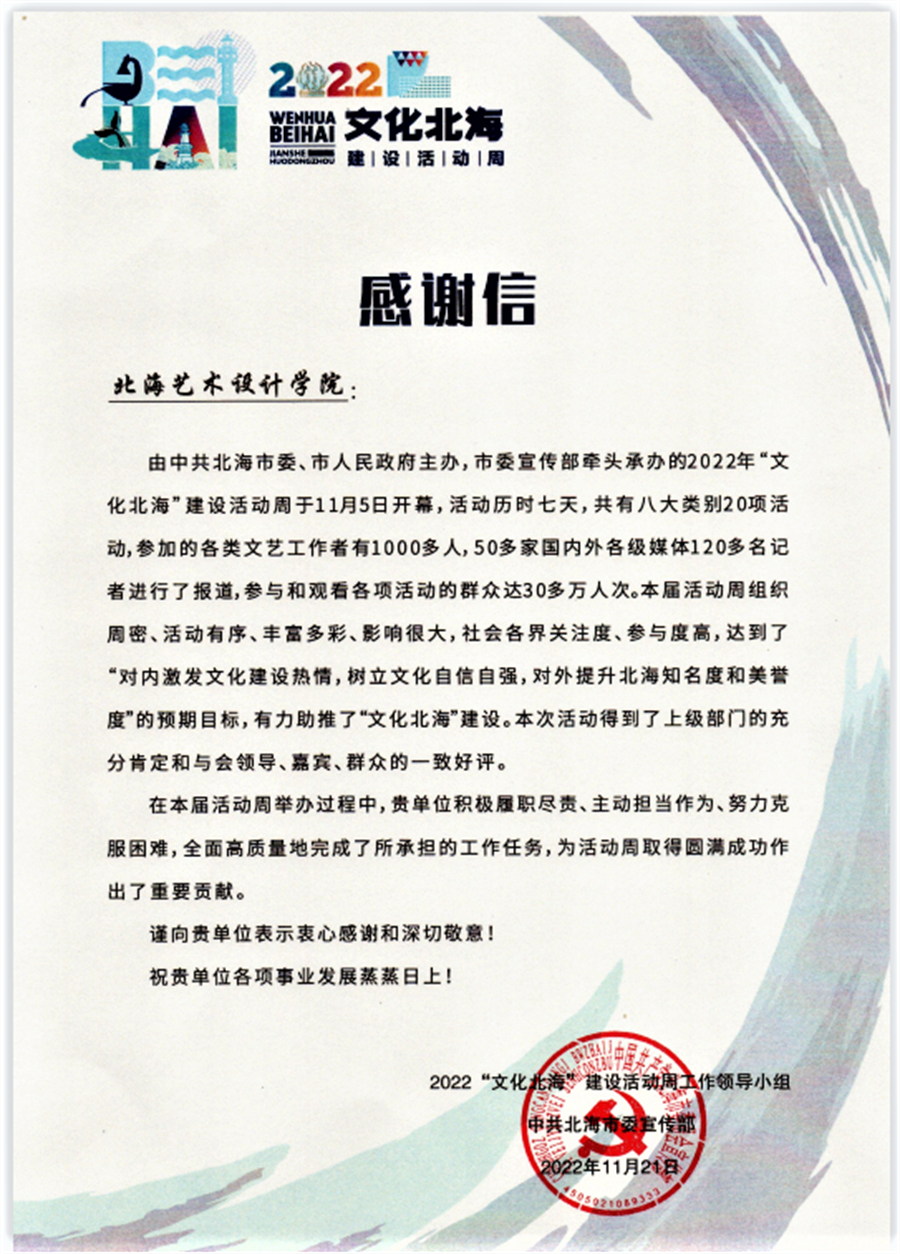 我校收到来自“文化北海”建设活动周的感谢信