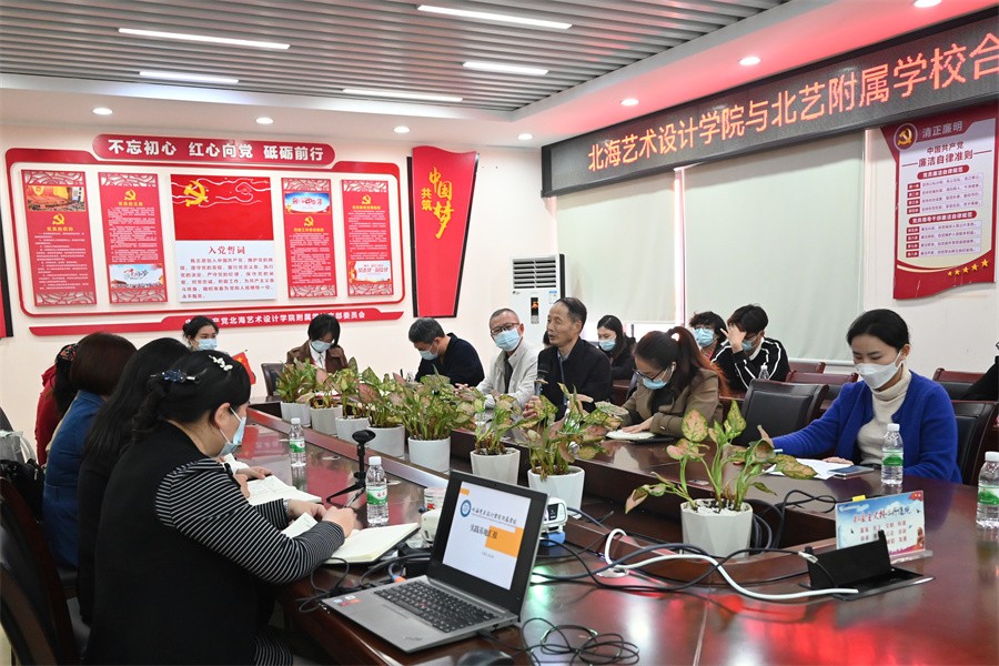 会上,包玉红校长简单介绍了学校师资,与北艺的合作历程、合作交流、合作课程、合作特色、合作参赛、办学成果等情况。双方围绕教学改革、学生实习实践、人才培养等方面的合作开展情况进行了深入的交流,对在重点培育“艺养教育”这一特色上取得的长足进步,双方均给予高度评价。其中,由艺术教育专业的师生与附校师生共同建设的童声合唱团,为附校在市级、区级、国家级比赛中多次斩获荣誉,进一步提升了附校在社会上的影响力,现已成为家长口中的“金字招牌”。包校长希望未来两校可以继续加深产教融合,扩大合作领域,加强校校共建,进一步推进教学改革,取得更多的教学成果。