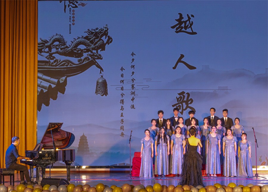 一首意境优美、荡人心绪的《越人歌》,拉开了演出的序幕。《大江东去》男生合唱,曲调淳朴、气息宽广,格调舒展、气韵潇洒。