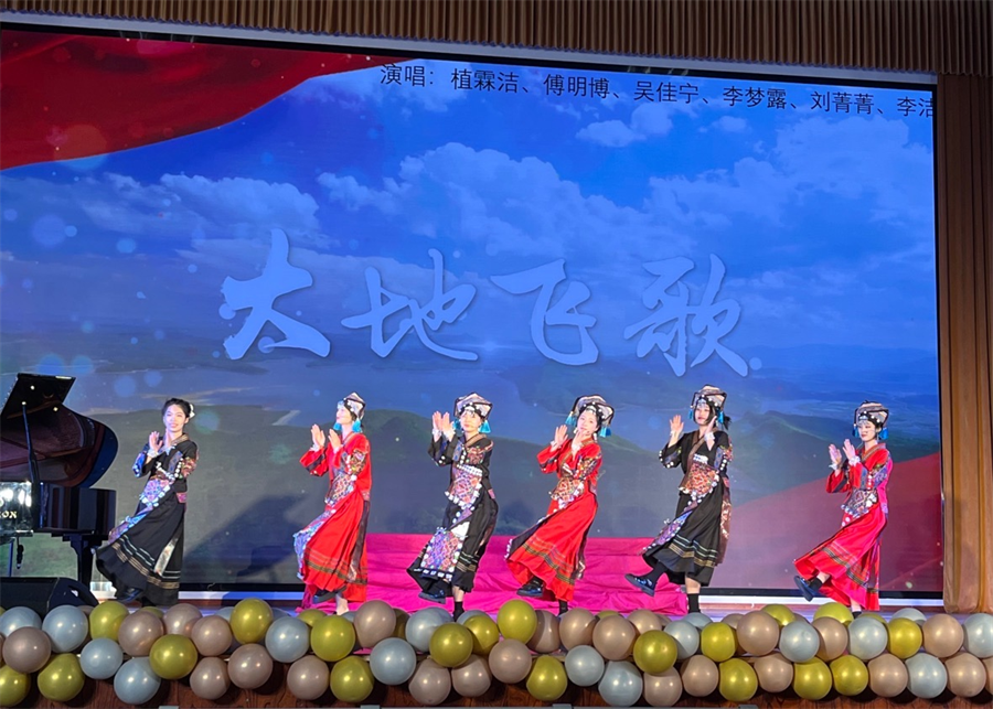《大地飞歌》这首在八桂大地家喻户晓的新民歌,在学生的载歌载舞中以欢快的节奏、明朗的曲调、浓郁的壮族民族风韵将演出现场气氛推向高潮。