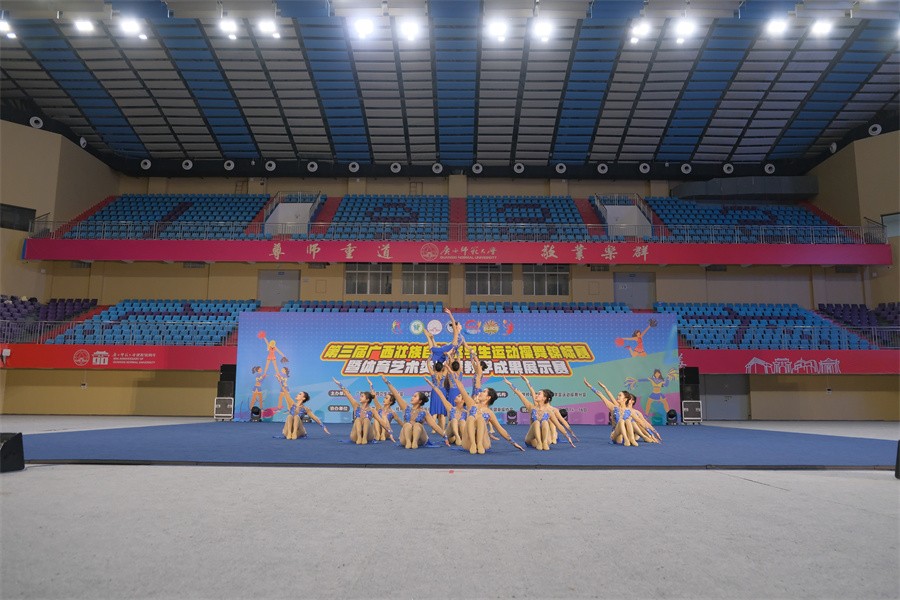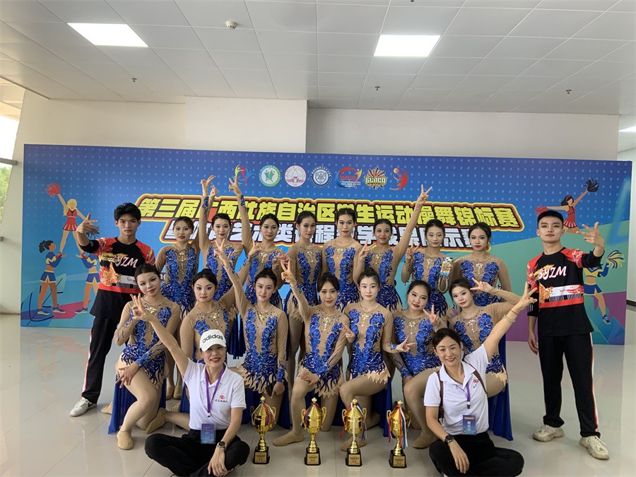6月14-16日,第三届广西壮族自治区学生运动操舞锦标赛暨体育艺术类课程教学成果展示赛在广西师范大学雁山校区综合体育馆落下帷幕,我校“战马”啦啦操队斩获普通本科组“第九套广播体操、集体爵士自选、双人爵士自选、双人花球自选”4项冠军,民族民间舞季军,同时斩获“体育艺术类课程教学成果展示赛”二等奖。