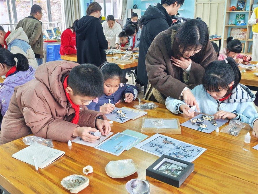 我校学子指导实验学校学生制作贝雕画